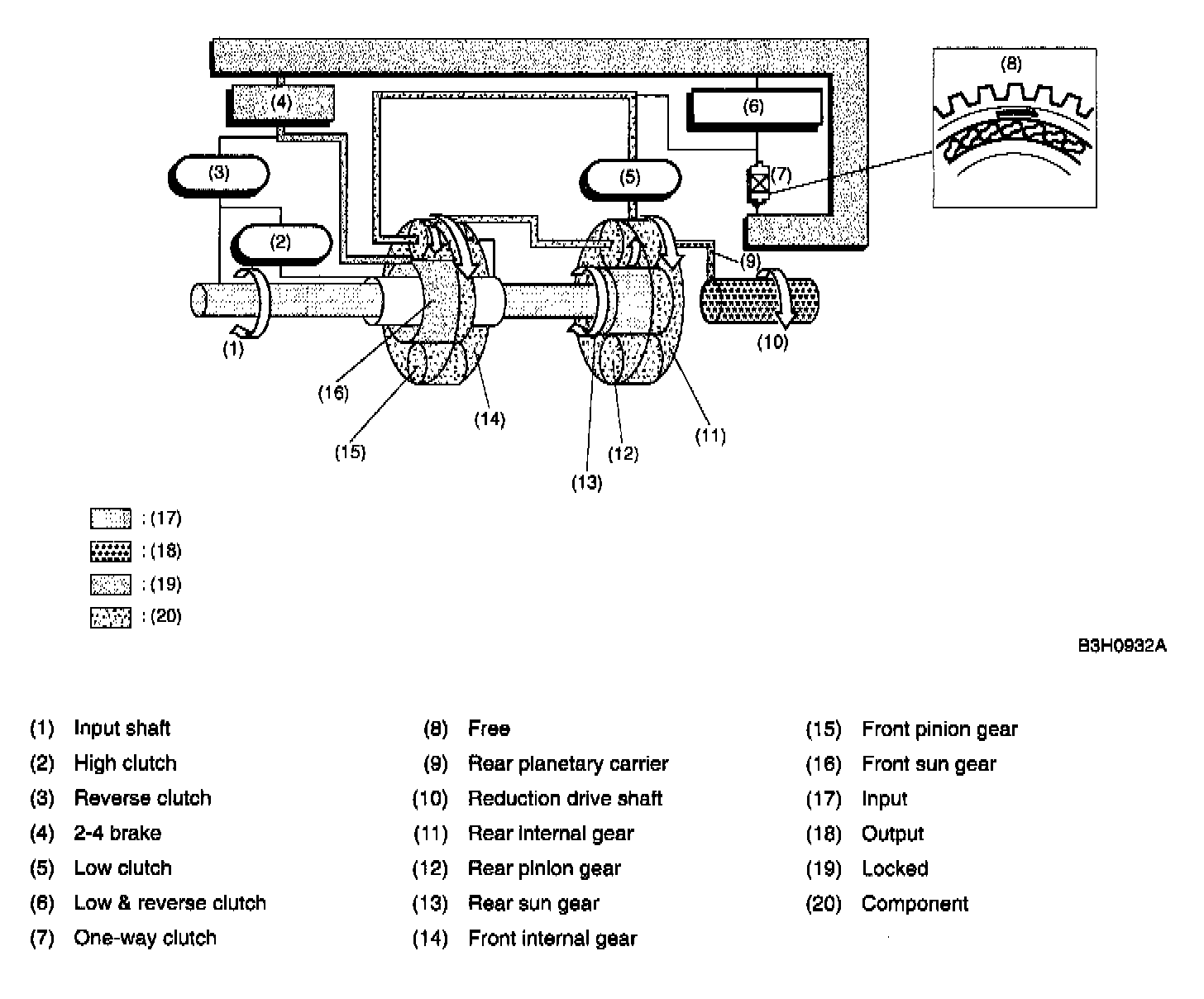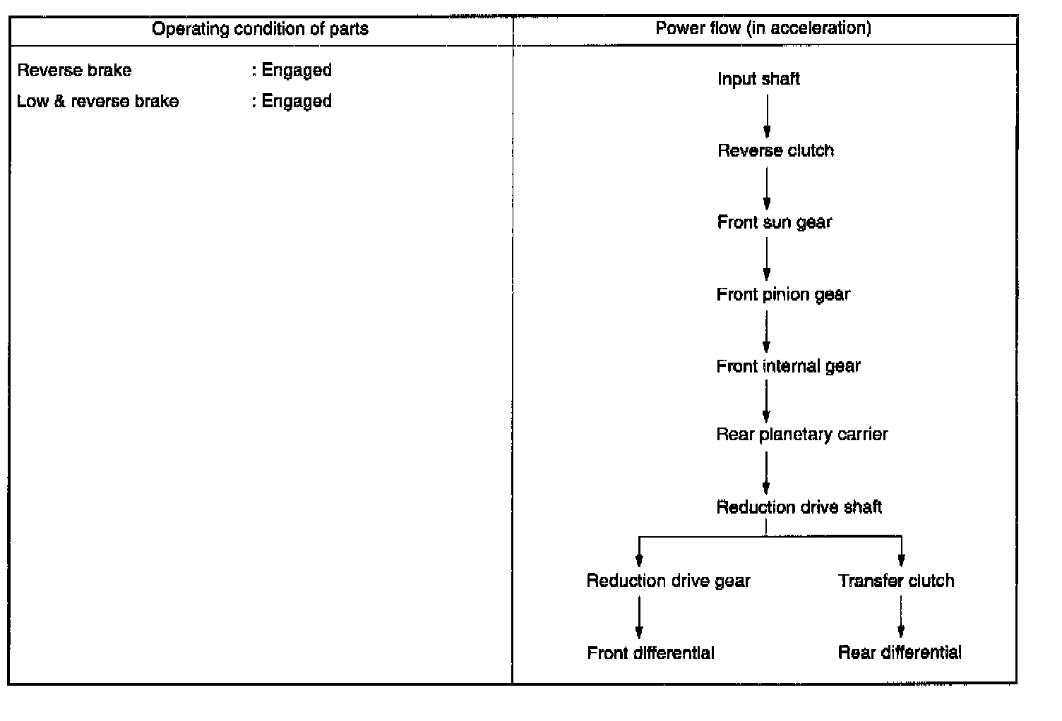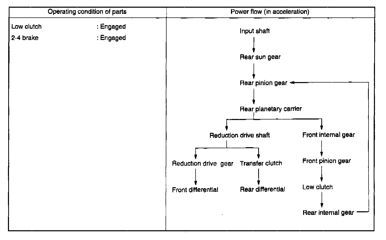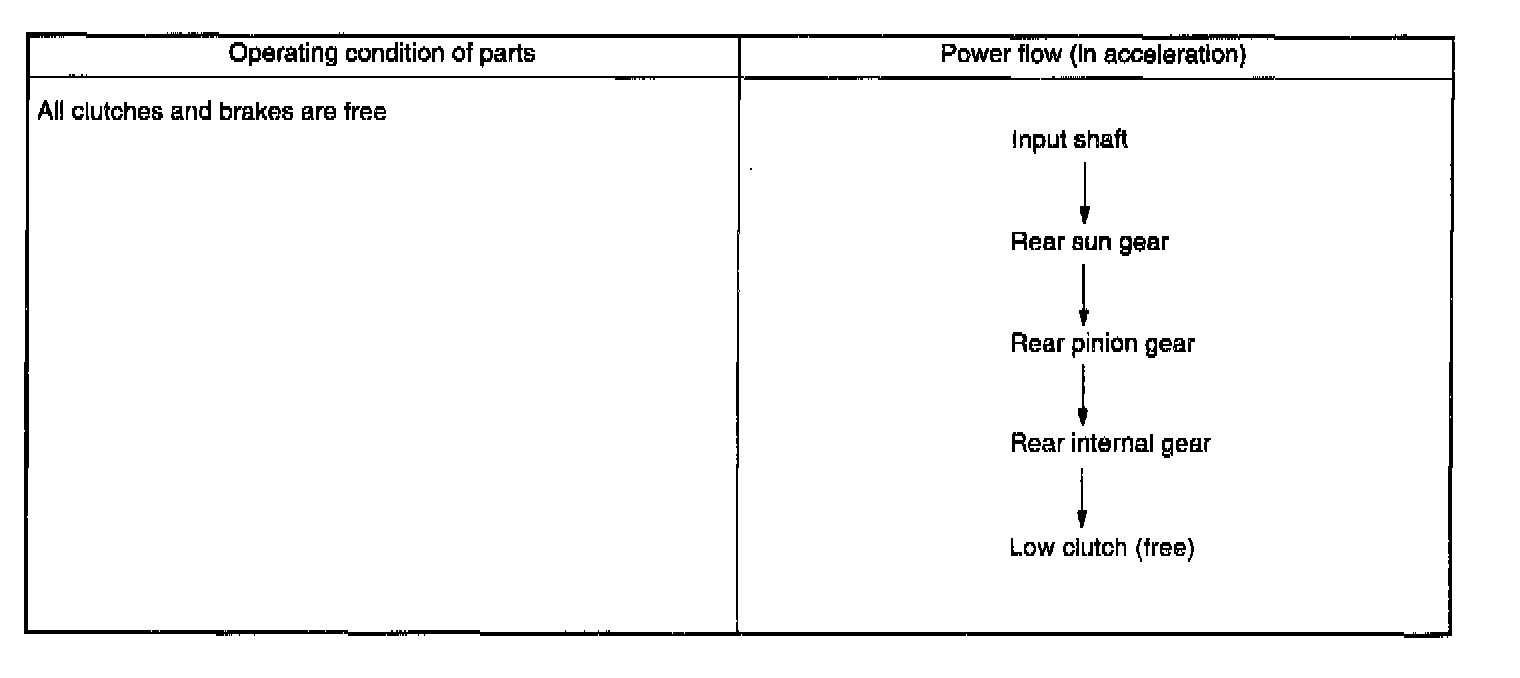 The one-way clutch is free because the low clutch rotates clockwise. Since the driving power is transmitted without being affected by the one-way clutch, the back driving force from the reduction drive shaft is transmitted to the input shaft, thus the engine braking effect being available.