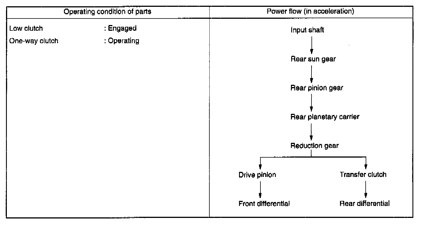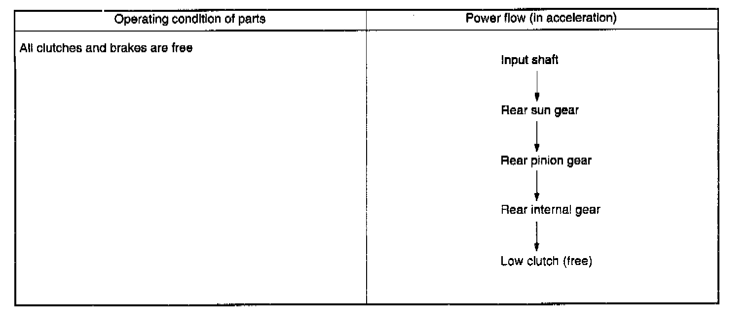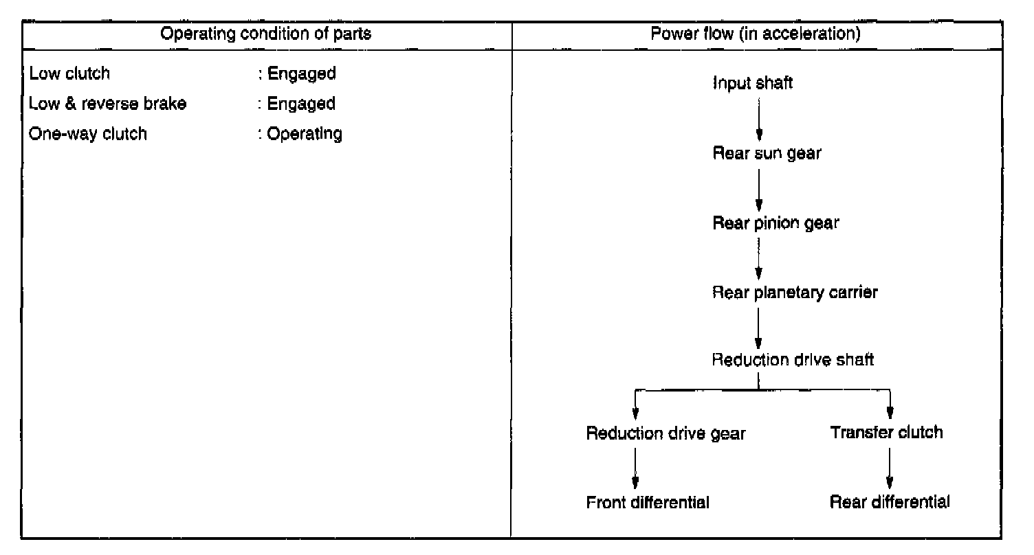 At 1st speed of this range, the low clutch and the low & reverse brake are thrown into engagement. The 1st speed in this range shows the same operation as the 1st speed in the D or 3 range. However, the one-way clutch produces no effect because the low & reverse brake is operated.