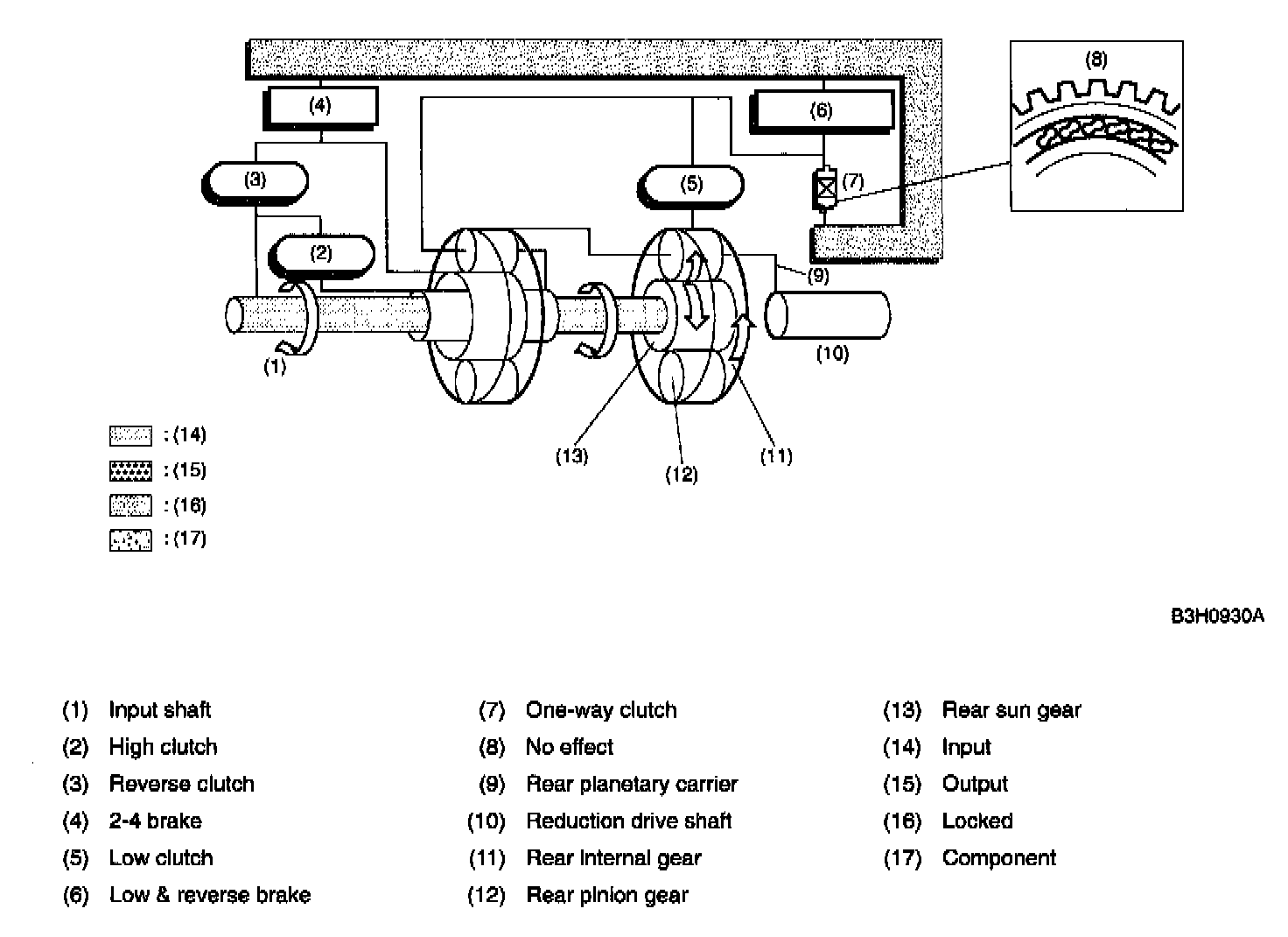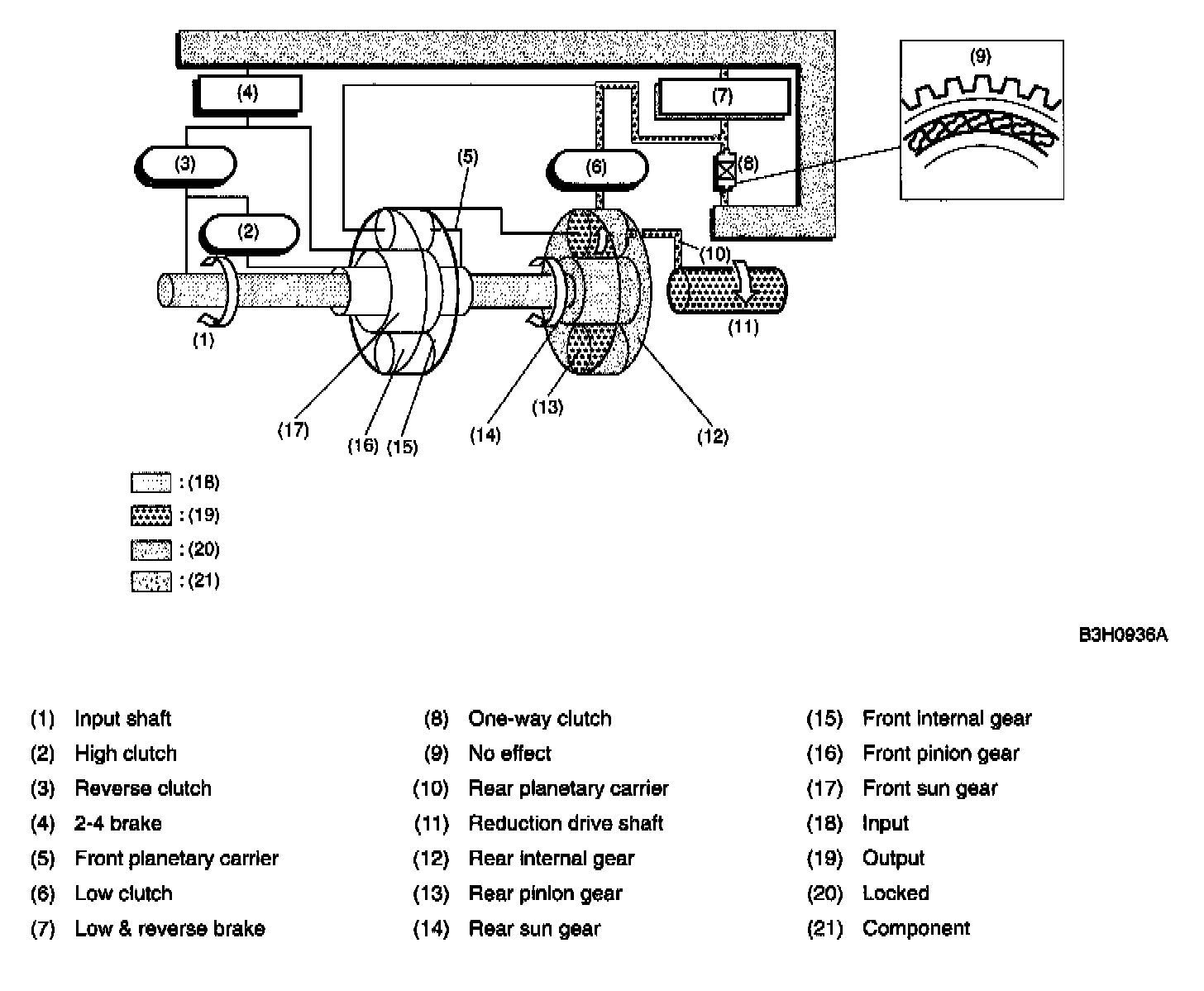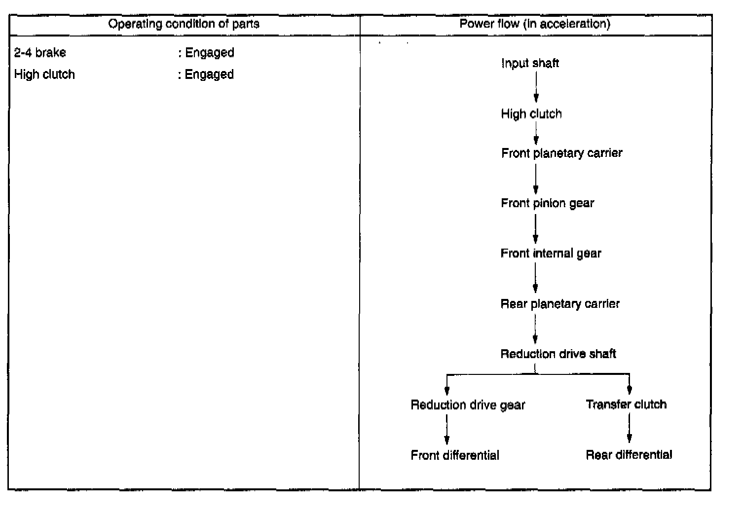 At 2nd speed, the driving power is transmitted without being affected by the one-way clutch. Therefore, the back driving force from the reduction drive shaft is transmitted to the input shaft, thus the engine braking effect being available.