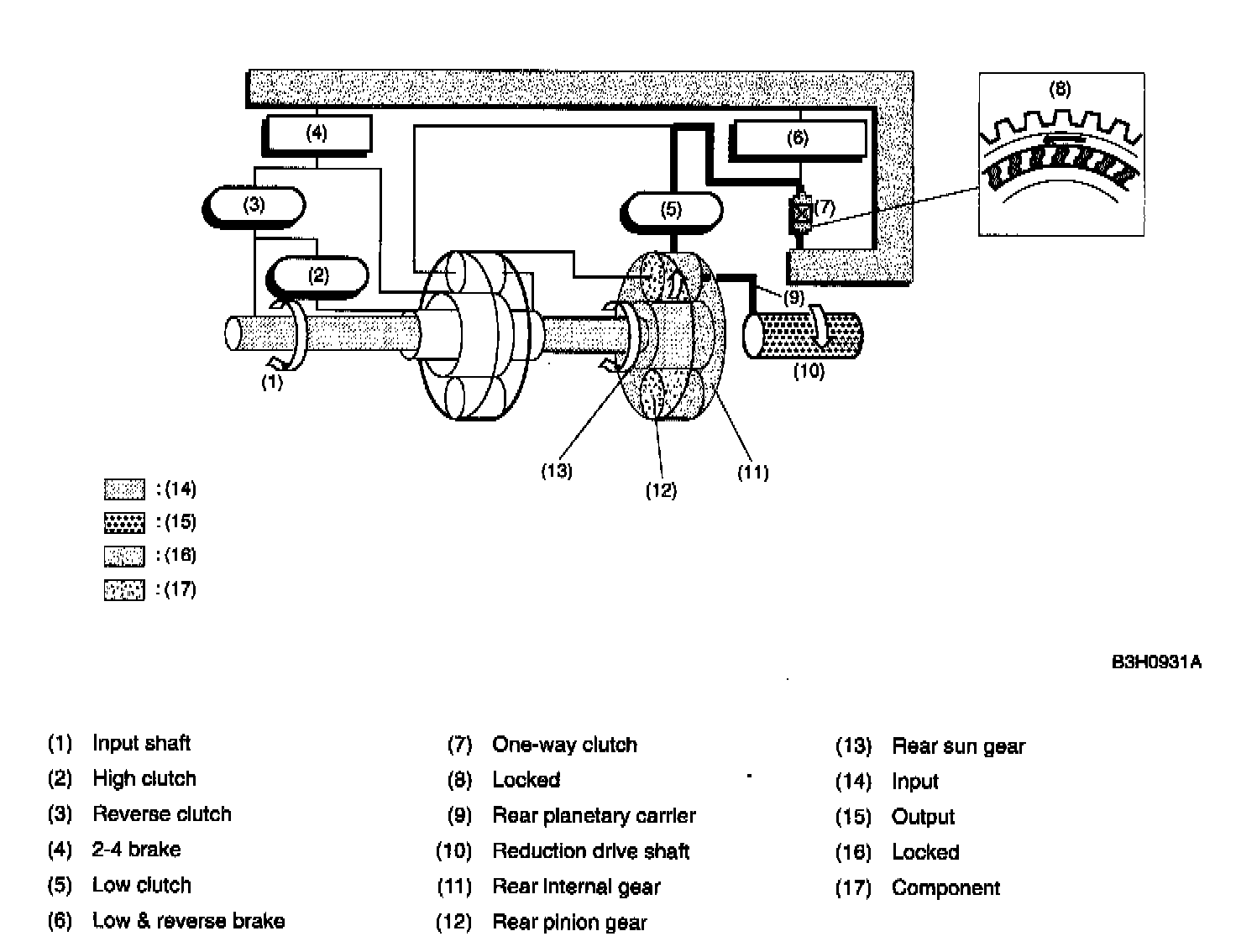 At 1st speed of these ranges, only the low clutch is in engagement. The rear internal gear which rotates idly in P and N ranges tries to rotate counterclockwise due to engaged low clutch. However, this is blocked by the one-way clutch and secured to the transmission case.
