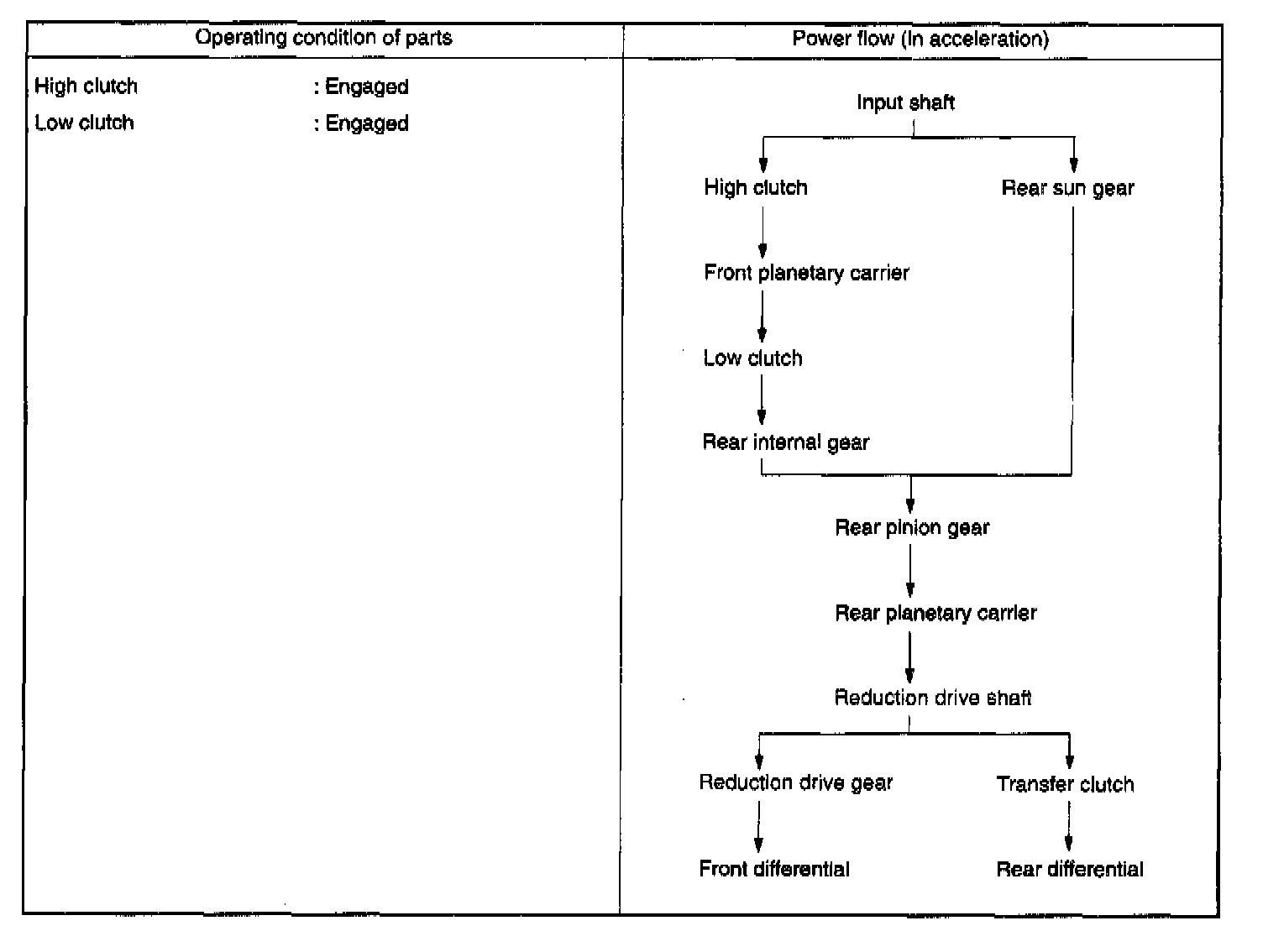 However, the rotation torque of the rear sun gear is not transmitted to the rear planetary carrier since the rear internal gear idles because of disengaged low clutch.