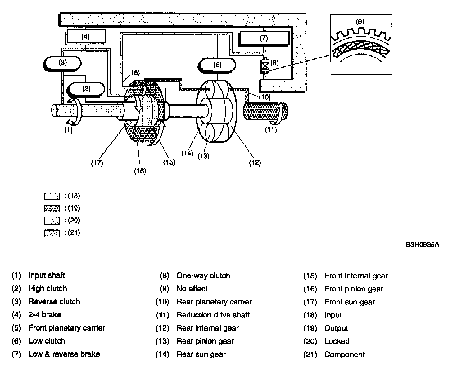 Since the rear sun gear and the high clutch drum are in mesh with the input shaft, they rotate together with input shaft.