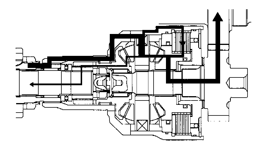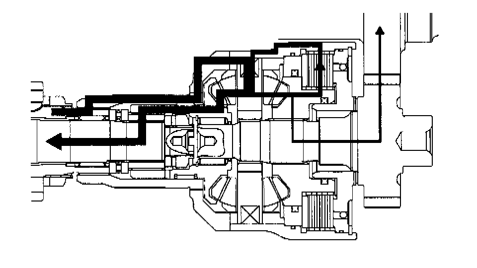 During normal straight driving (on flat roads at constant speed), all four wheels rotate at the same speed. The center differential delivers engine torque to the front and rear drive axles. The viscous coupling does not perform the differential-action control because there is no rotating speed difference between the front and rear drive shafts.