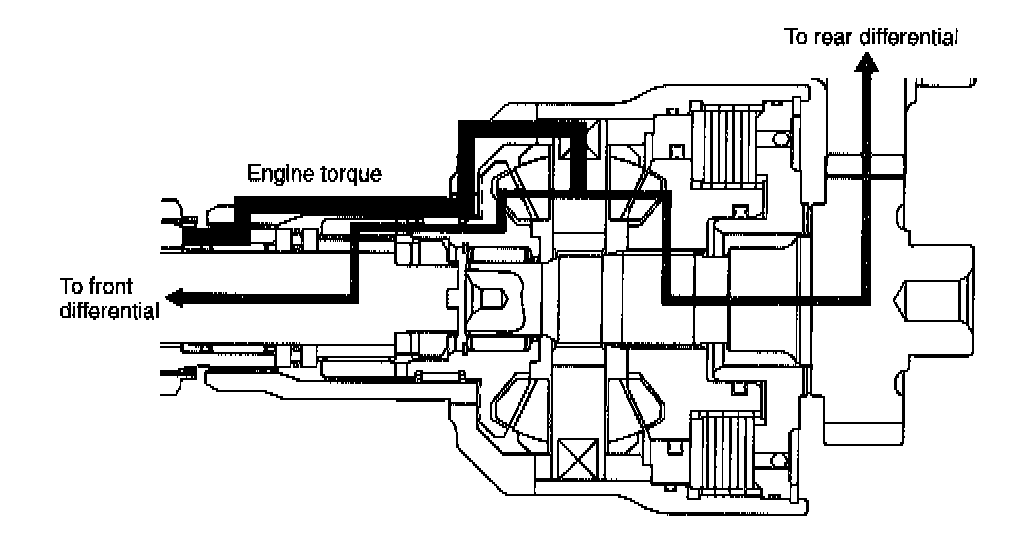 During normal driving (when there is no speed difference between the front and rear wheels), the center differential delivers drive power to the front and rear wheels at a torque ratio of 50:50.