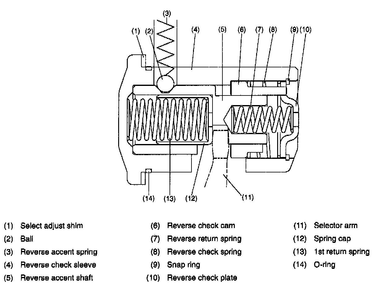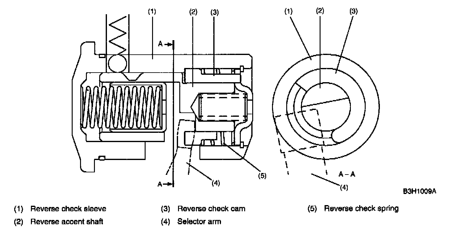 The selector arm again moves to the 5th and reverse side. When the shift is made to reverse, the selector arm moves to the reverse position while pushing the reverse accent shaft and reverse check cam together.