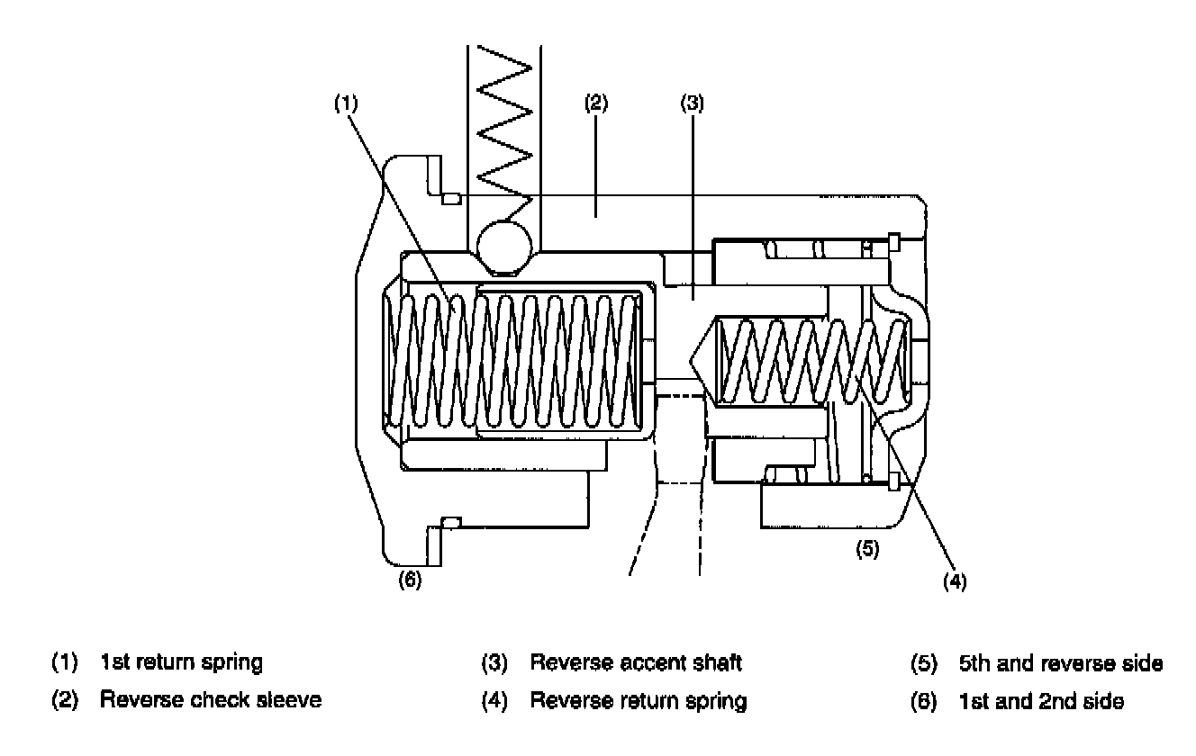 The selector arm moves to the 5th side pushing the reverse accent shaft. When the selector arm pulls out of the reverse check cam, the reverse check cam is returned to the original position by the reverse check spring.