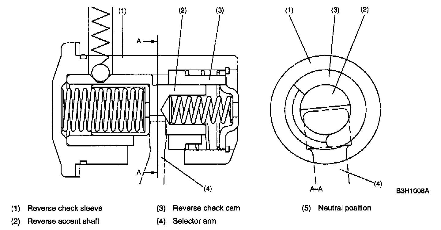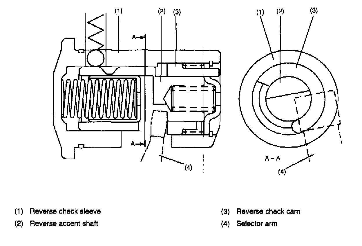 The reverse check sleeve and reverse accent shaft have a notch, and the selector arm is placed between the notches. The position of the selector arm shown is the neutral position (hereafter referred to as (N) position). The point where the selector arm stops when moved to the left is the 1st and 2nd position. On the contrary, the point where the selector arm stops when moved to the right is the 5th and reverse position.