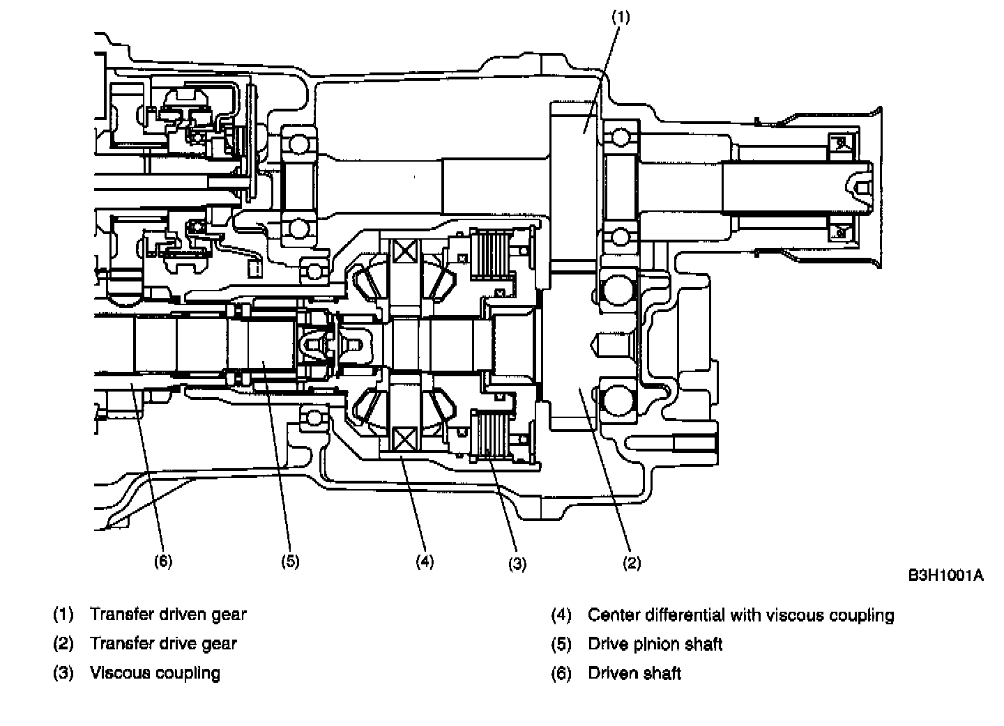 The center differential is composed of a mechanical differential and a viscous coupling and transmits the power from the transfer drive gear to the drive pinion shaft and the driven shaft.