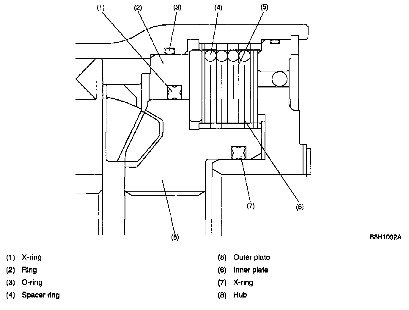 A mixture of silicone oil and air is sealed in the space inside the center differential case. An "X'' seal ring prevents silicone oil from entering the transmission. This could occur when silicone oil is highly pressurized due to an increase in rotating speed difference between the front and rear wheels.