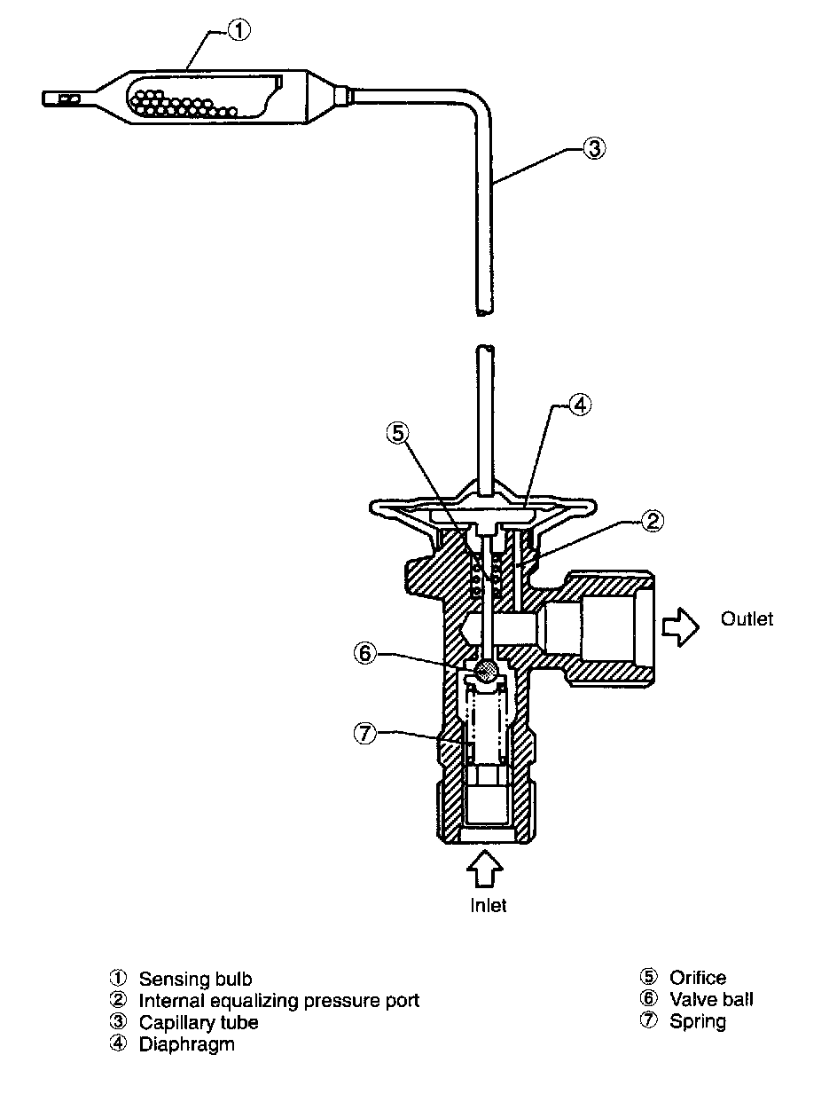 The expansion valve opening is automatically controlled by the functions of three force: the pressure of the temperature-sensing bulb (P(1)) containing a liquid or vapor, the pressure at the expansion valve outlet (P(2)), and the force of the spring (F).