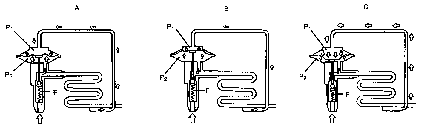 Since the temperature around the evaporator is constant, the pressure in the evaporator is equal to that of the temperature-sensing bulb. Therefore, the force of the spring is greater than these pressures and the pressures are in the following condition: