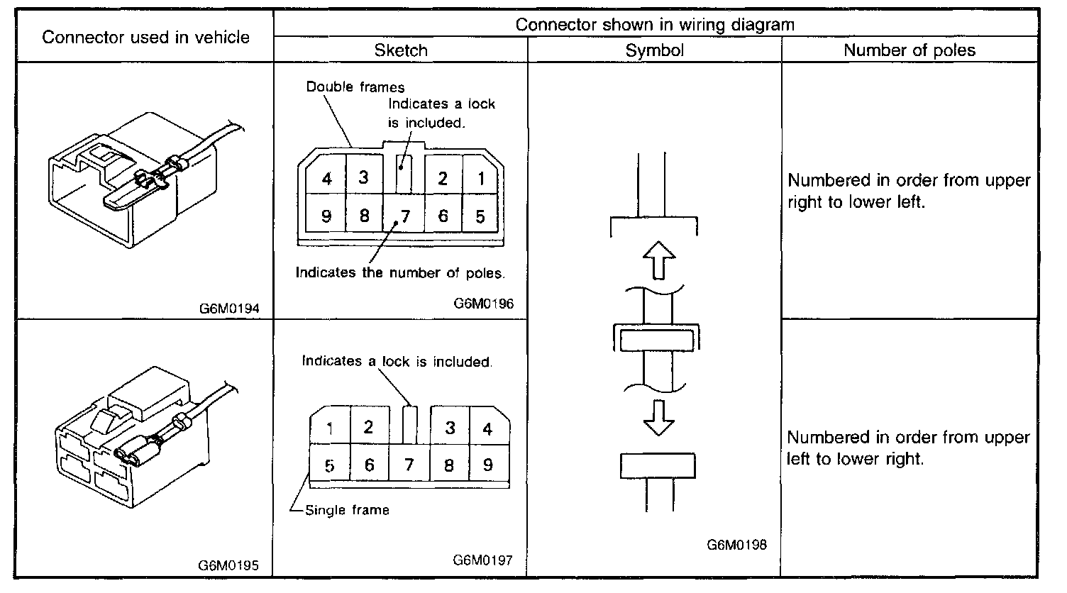 - The number of poles or pins, presence of a lock, and pin number of each terminal are indicated in the sketch of each connector. In the sketch, the highest pole number refers to the number of poles which the connector has. For example, the sketch of the connector shown in figure indicates the connector has 9 poles.
