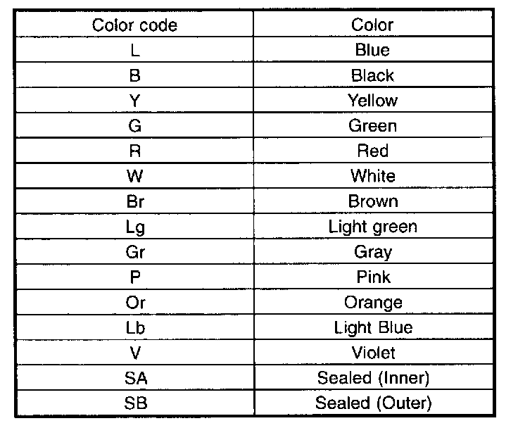 - The wire color code, which consists of two letters (or three letters including Br or Lg), indicates the standard color (base color of the wire covering) by its first letter and the stripe marking by its second letter.