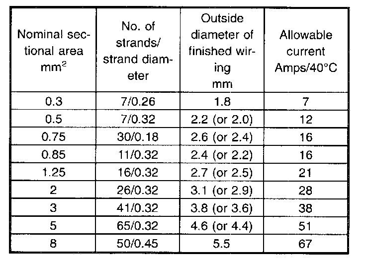 - The table lists the nominal sectional areas and allowable currents of the wires.