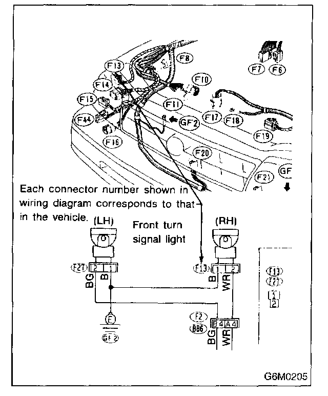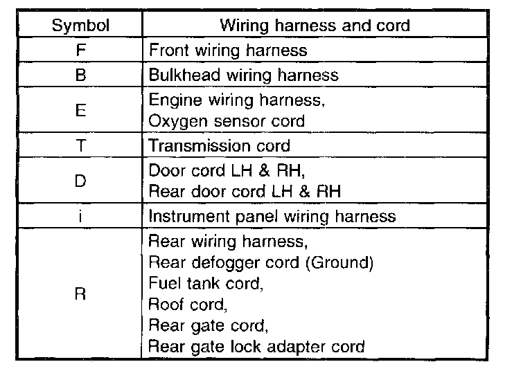 - Each connector number shown in the wiring diagram corresponds to that in the wiring harness. The location of each connector in the actual vehicle is determined by reading the first character of the connector (for example, a "F" for FB, "i" for i16, etc.) and the type of wiring harness.