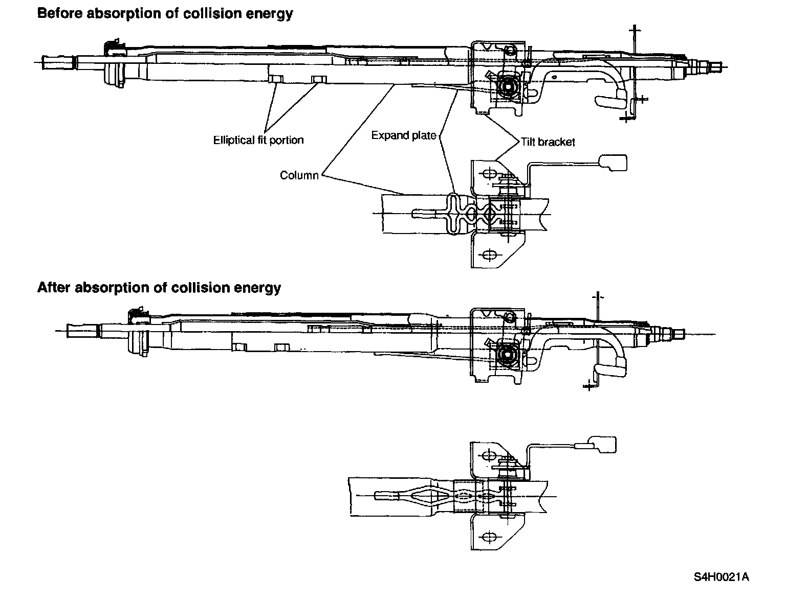 - To absorb the engine backward energy in the event of a collision, an elliptical fit type column pipe has been adopted. The energy is absorbed by collapse of the elliptical fit portions as their surfaces come in contact with each other and receive the bend load.