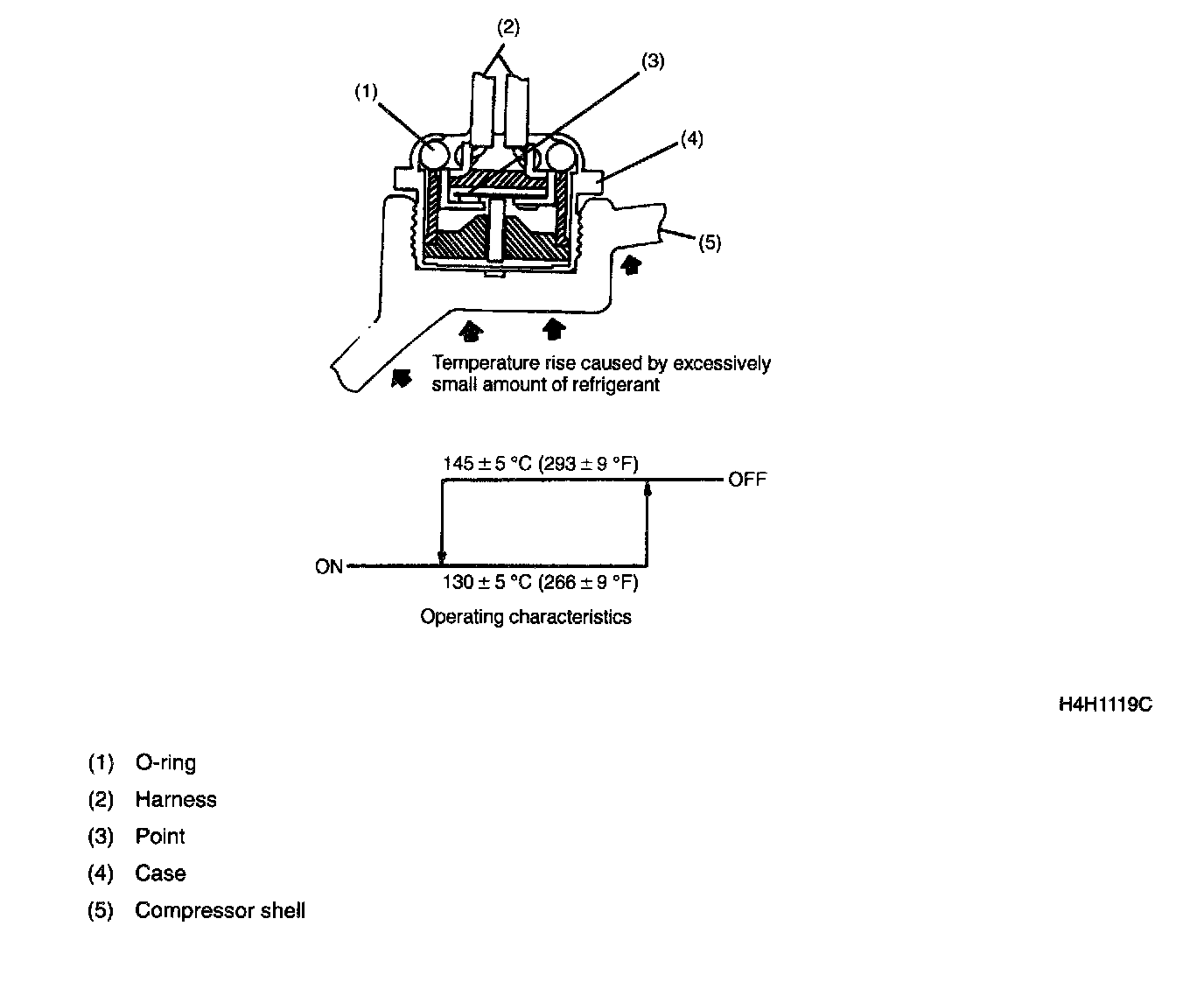 Compressor Saving SensorThe compressor saving sensor, mounted on the surface of the compressor case, forces the compressor to the OFF state when the gas temperature rises or the case surface temperature becomes abnormally high due to poor lubrication.