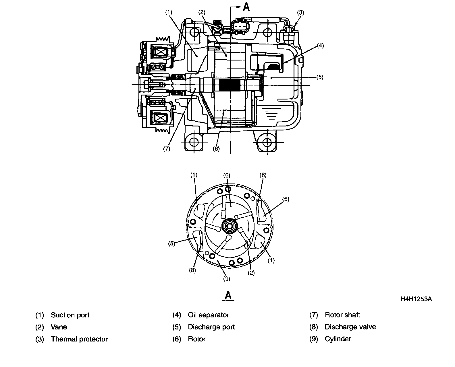 CompressorThe vane rotor type compressor turns around the center axis of the elliptical cylinder, and the vanes, with their ends in contact with the inside wall of the cylinder, move up and down the rotor grooves. The vanes are positioned around the rotor, each equally spaced apart from another. Both sides of the cylinder are sealed by side blocks. The space, enclosed by the neighboring vanes, two side blocks, outer circumference of the rotor and inside wall of the cylinder, becomes smaller as the rotor turns, thereby compressing the internal gas. When the end of a vane sliding on the inside wall of the cylinder goes past the suction port, the vane closes the suction port. The compression stroke at the position. When the gas ahead of the vane is compressed and discharged through the discharge valve, the next vane is already on the suction stroke. Since suction and compression of the gas are separately performed in this manner, the compressed gas left behind in the discharge port never returns to the suction port. Since no suction valve is required, there is no loss caused by a suction valve. (A high pressure trigger valve provided on the rear head to apply a pressure to the back plane of vane.)