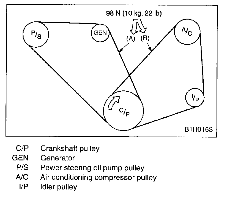 2. Check drive belt tension and adjust it if necessary by changing alternator installing position and/or idler pulley installing position.