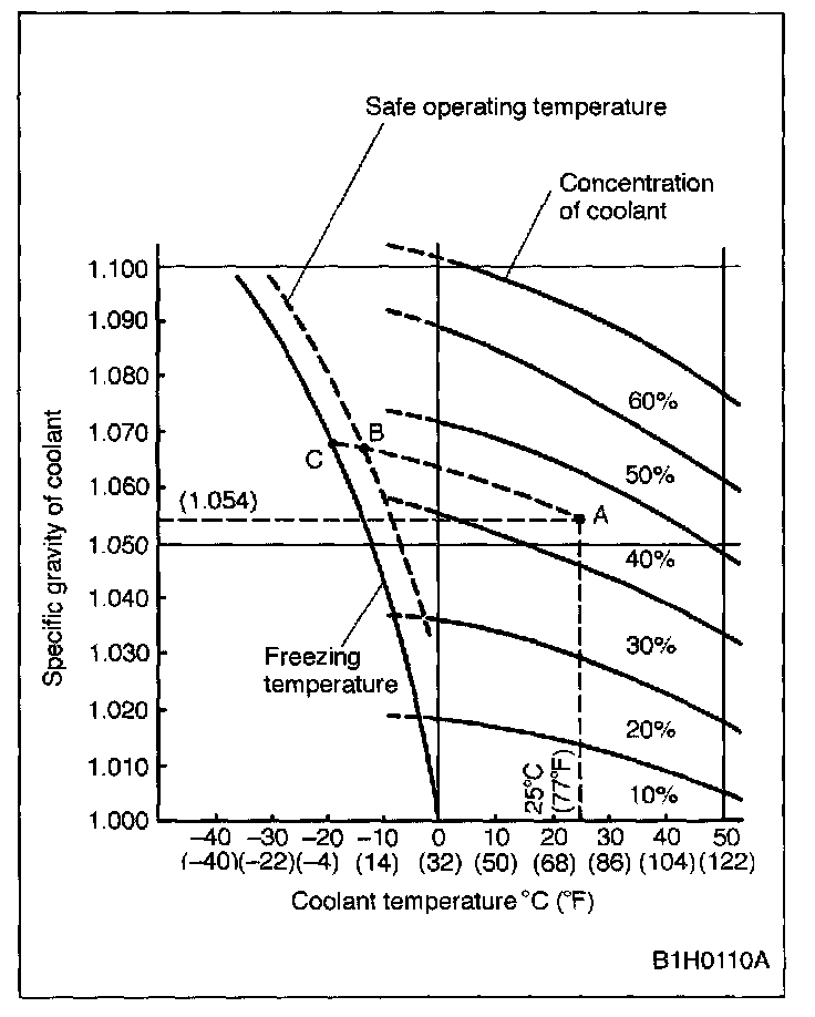 If the coolant temperature is 25 °C (77 °F) and its specific gravity is 1.054, the concentration is 35% (point A), the safe operating temperature is -14 °C (7 °F) (point B), and the freezing temperature is -20 °C (-4 °F) (point C).