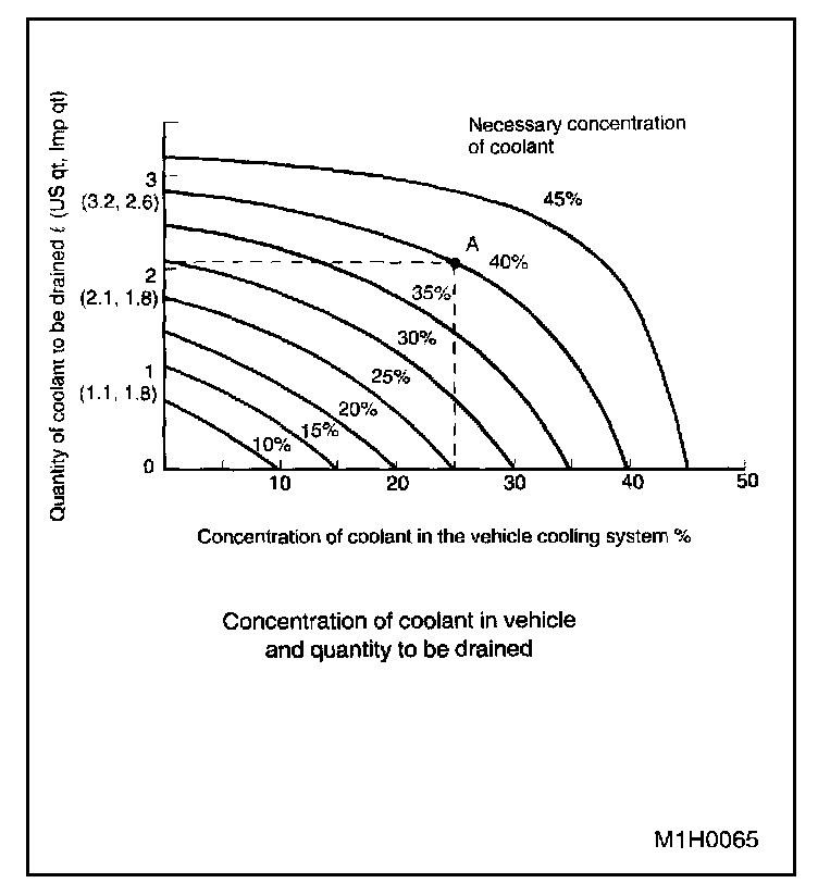 Assume that the coolant concentration must be increased from 25% to 40%. Find point A, where the 25% line of coolant concentration intersects with the 40% curve of the necessary coolant concentration, and read the scale on the vertical axis of the graph at height A. The quantity of coolant to be drained is 2.1 liters (2.2 US qt, 1.8 Imp qt). Drain 2.1 liters (2.2 US qt, 1.8 Imp qt) of coolant from the cooling system and add 2.1 liters (2.2 US qt, 1.8 Imp qt) of the undiluted solution of SUBARU coolant.