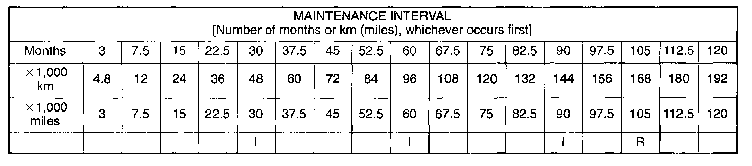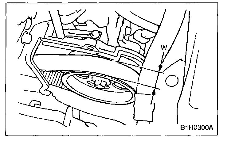 4. Measure liming belt width W. If it is less than 27 mm (1.06 in), check idlers, tensioner, water pump pulley and cam sprocket to determine idler alignment (squareness). Replace worn timing belt.