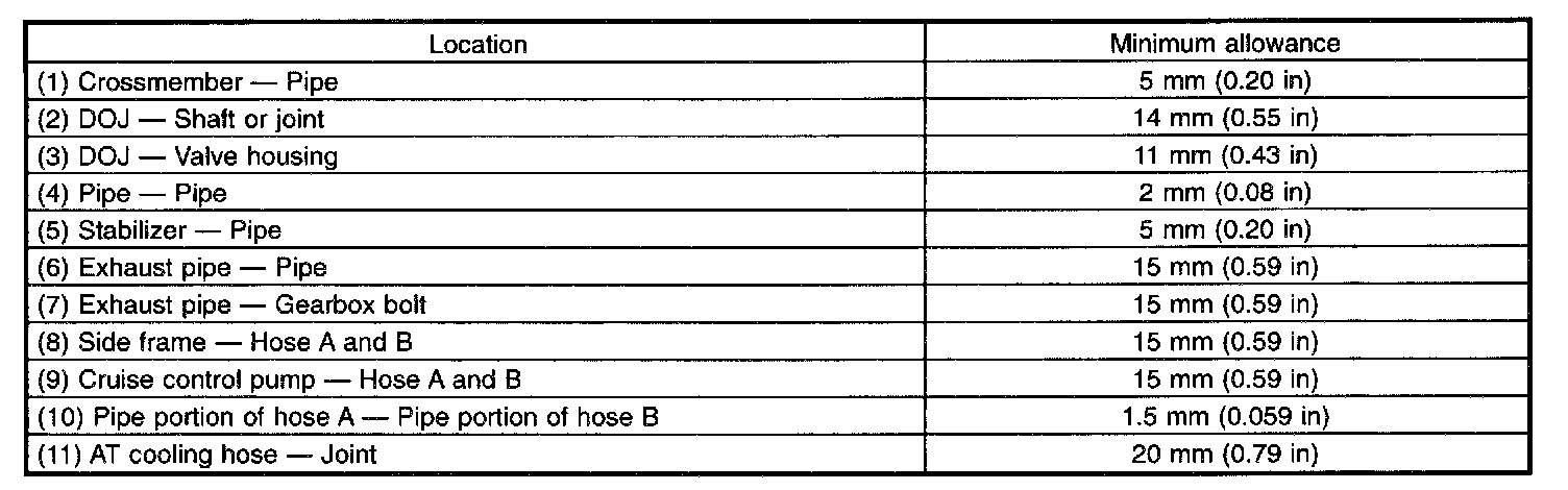This table lists various clearances that must be correctly adjusted to ensure normal vehicle driving without interfering noise, or any other faults.