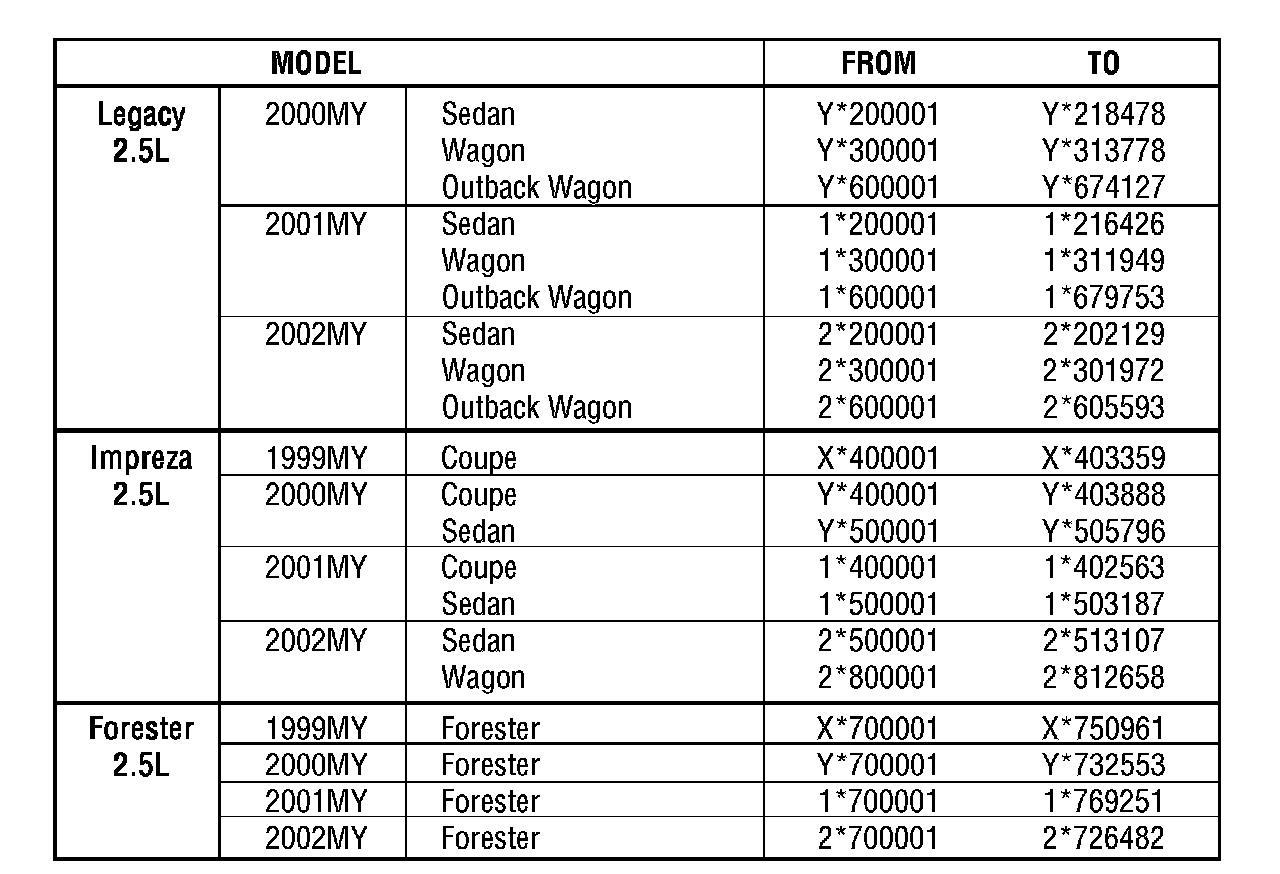 2000-2002 MY Subaru Legacy and Outback with 2.5L engine.