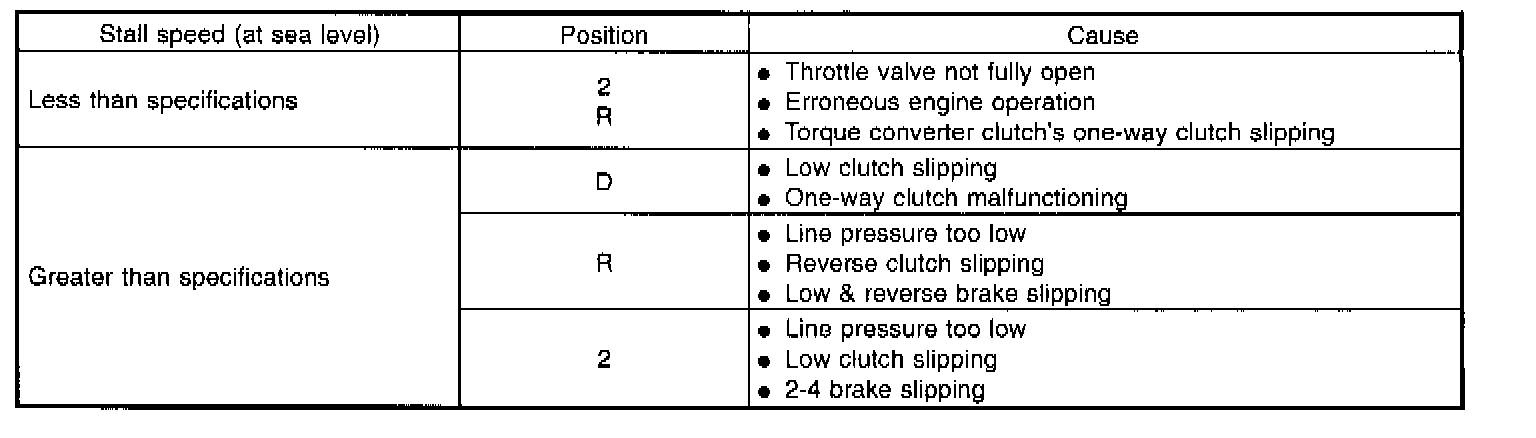 - If the stall speed is higher than the specified range, attempt to finish the stall test in as short a time as possible, in order to prevent the automatic transmission from sustaining damage.