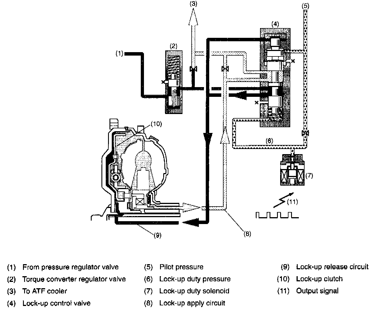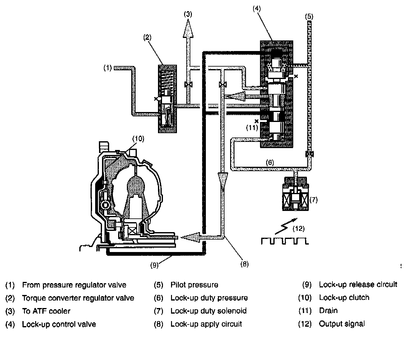 The lock-up engaging and disengaging conditions are set for 4th gear shift range, gear position and shift pattern and correspond to the throttle position and vehicle speed, and the duty solenoid electronically controlled by TCM controls the lock-up clutch. The lock-up clutch engagement and disengagement are controlled by the lock-up control valve.
