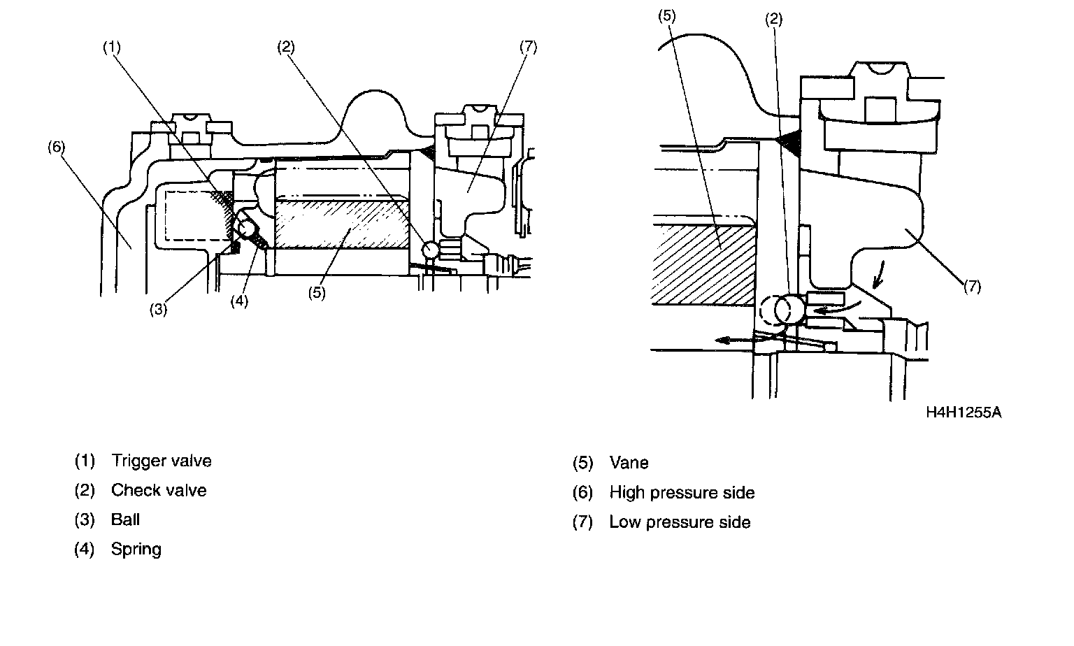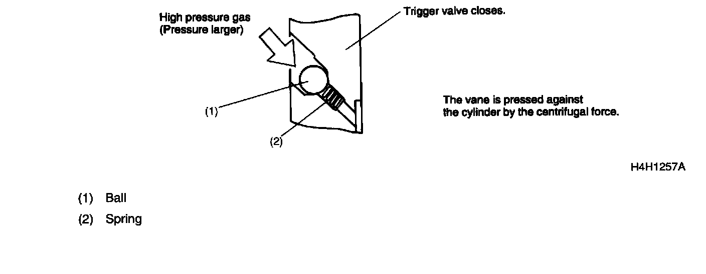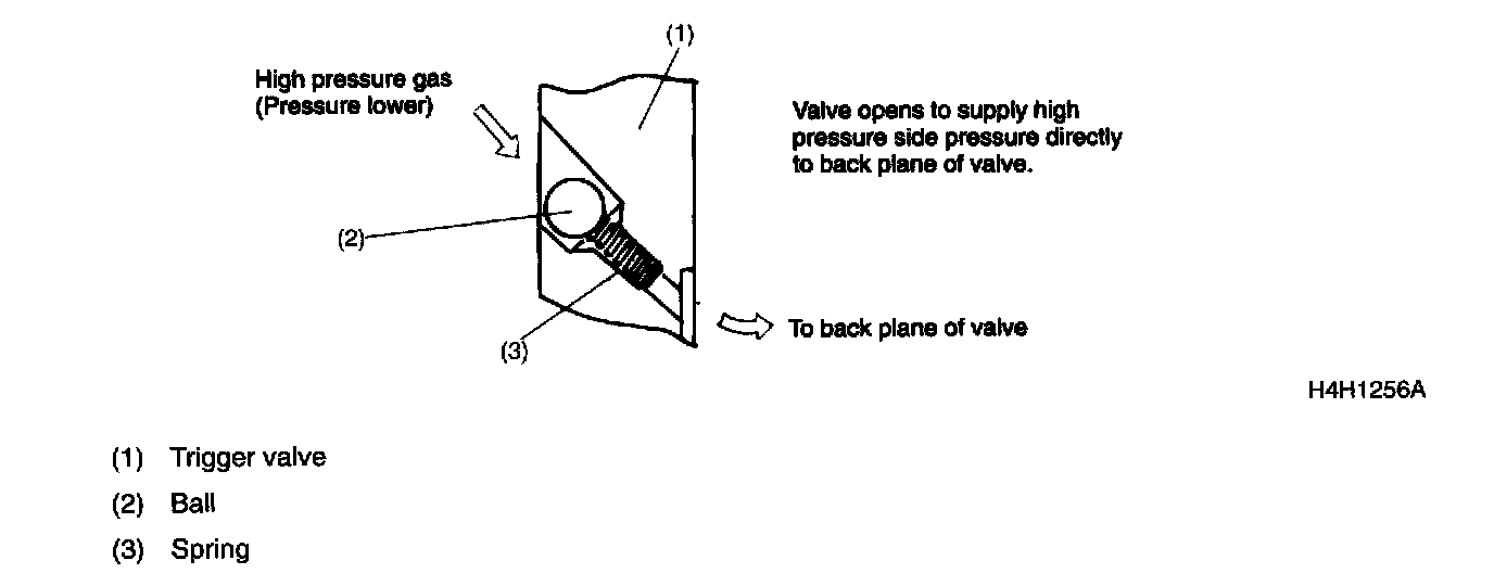 Trigger ValveTo ensure that when the compressor is started, the vanes move out smoothly under all conditions, and minimize the noise that will be produced when the vanes strike the cylinder at the time, a mechanism combining the low pressure side check valve and high pressure side trigger valve has been adopted. When the vehicle is parked for a long period in the middle of summer for example, the suction side pressure may be slightly higher than the discharge side pressure. When the compressor is started under such a condition, the low pressure side check valve introduces the low pressure side gas to the back plane of vane, thereby causing the vane to move out.