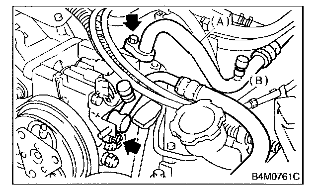 7. Install high-pressure hose (B) (Flexible hose Pd) and low-pressure hose (A) (Flexible hose Ps):Connect high-pressure hose (B) and low-pressure hose (A) with compressor.