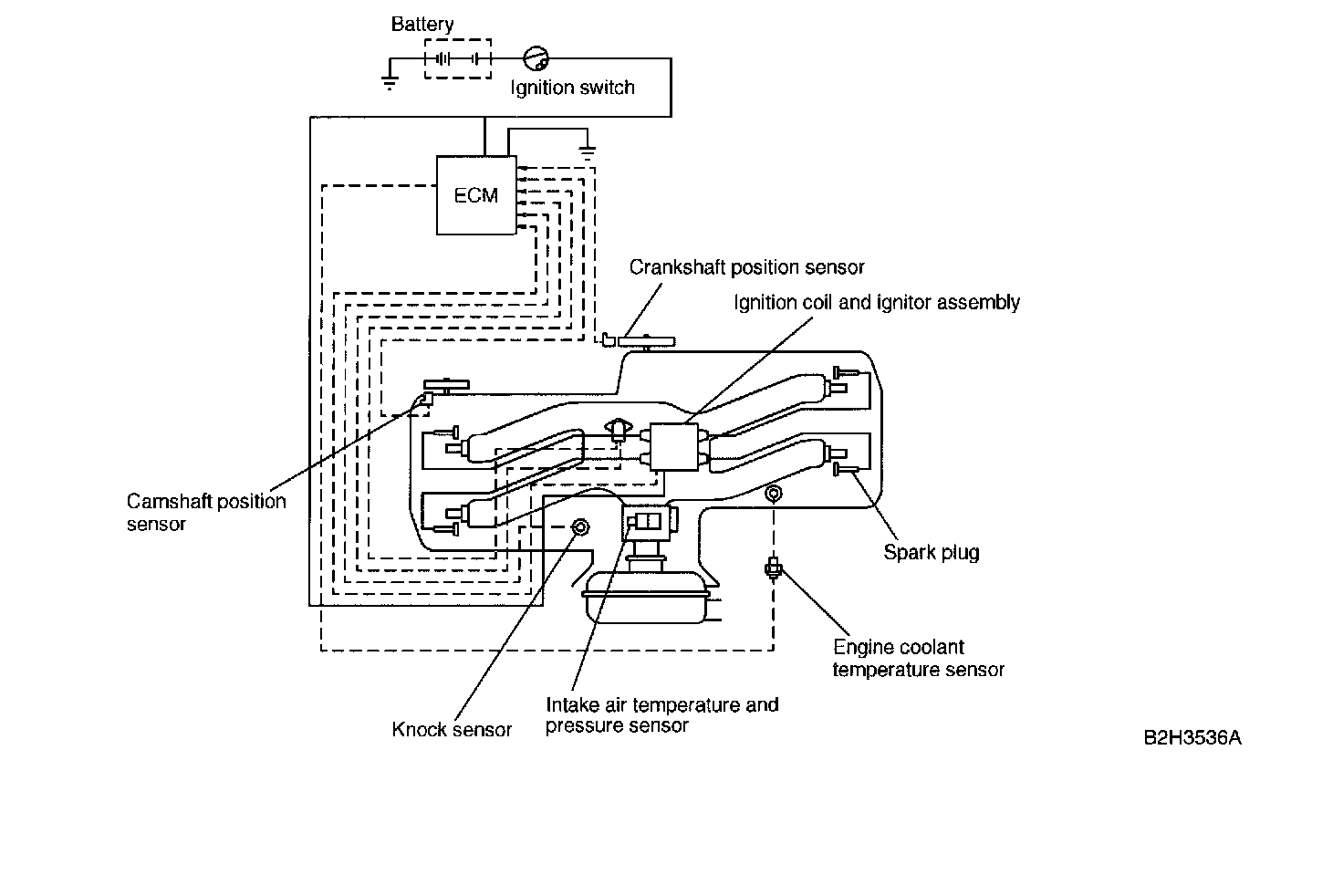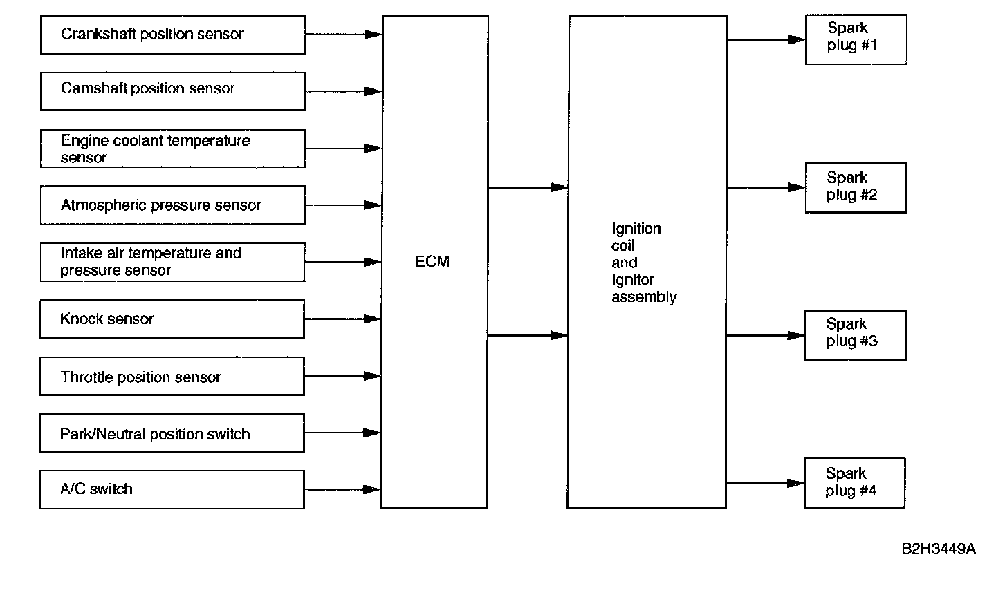 The ECM determines the optimal ignition timing according to signals sent from various sensors (which monitor the operating conditions of the engine), and sends a signal to the ignitor.