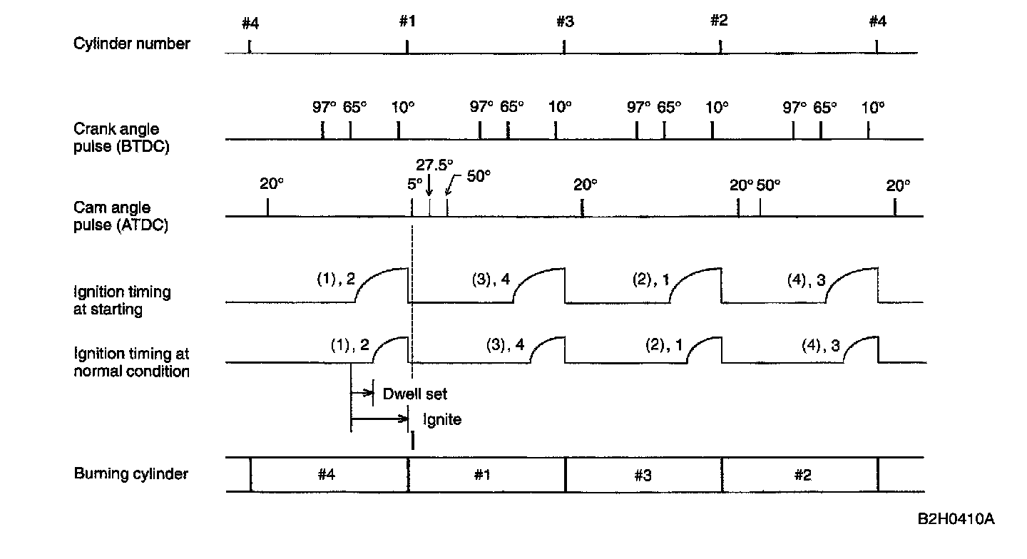 Engine speed fluctuates at the starting condition, so the ECM cannot control the ignition timing. When such a condition exists, ignition timing is fixed at 10^ BTDC by using the 10° signal.