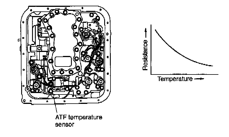 This sensor is mounted to the control valve in the transmission. It detects temperature change as an analog electrical signal. The output characteristics of the sensor are shown below.