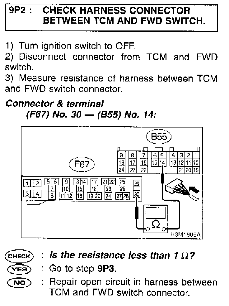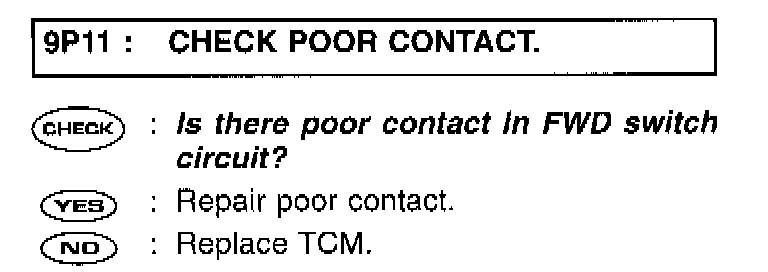 9P2: CHECK HARNESS CONNECTOR BETWEEN TCM AND FWD SWITCH.
