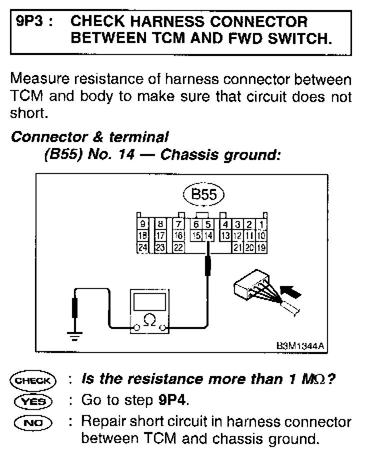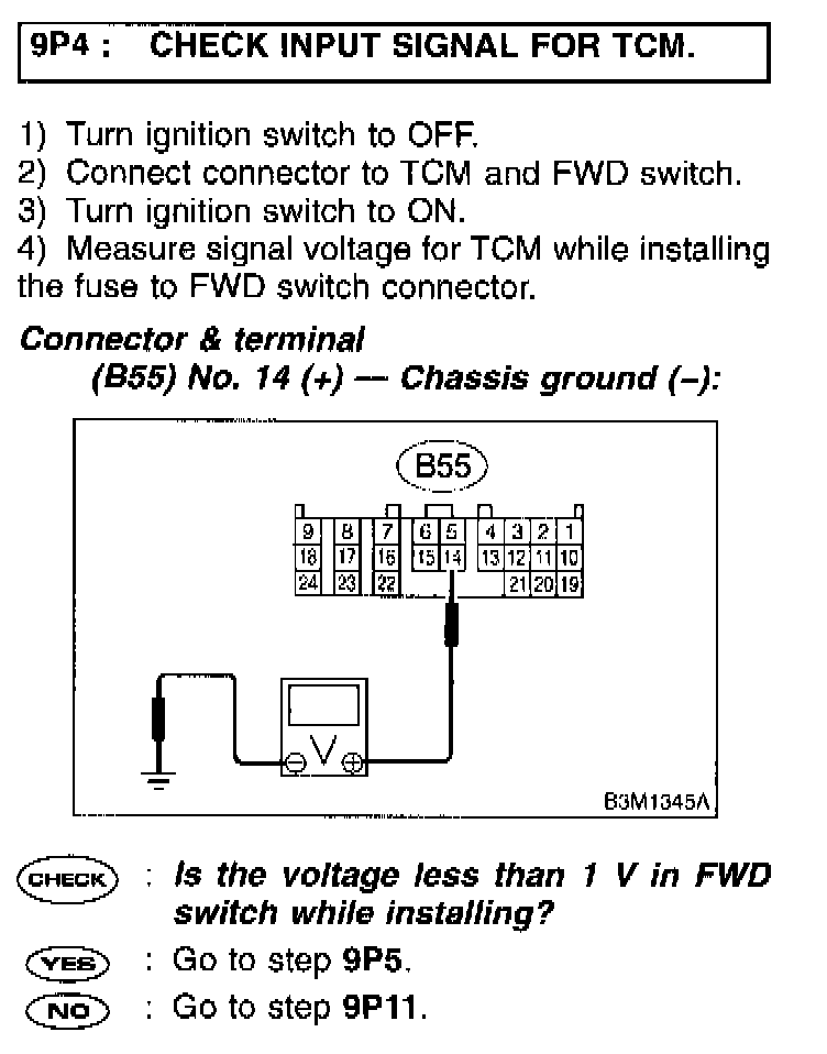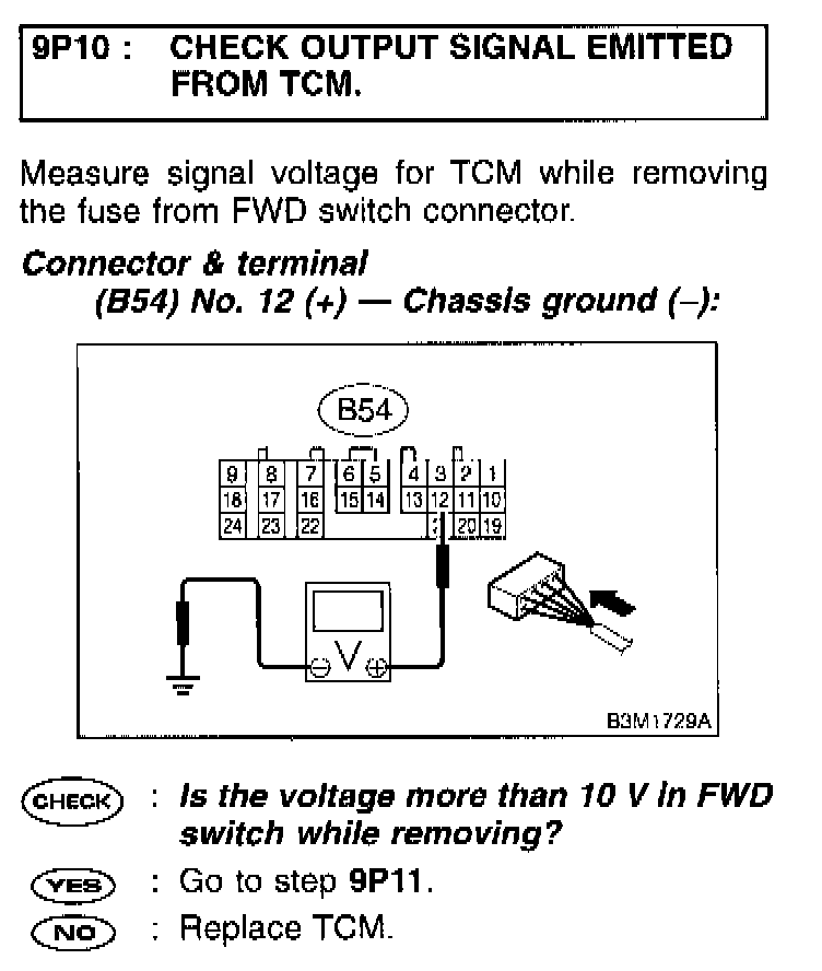 9P3: CHECK HARNESS CONNECTOR BETWEEN TCM AND FWD SWITCH.