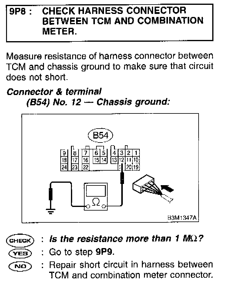 9P8: CHECK HARNESS CONNECTOR BETWEEN TCM AND COMBINATION METER.