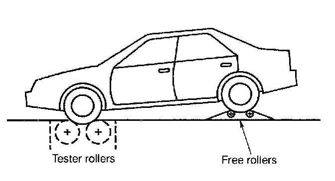 - Do not abruptly depress/release clutch pedal or accelerator pedal during tests even when engine is operating at low speeds since this may cause vehicle to lump off test machine.