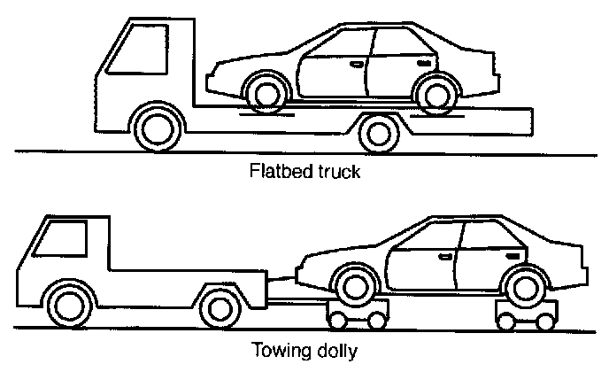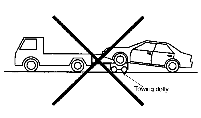 - Do not tow vehicle with only front or rear wheels placed on towing dolly or flat-bed truck. This may degrade viscous coupling performance or cause vehicle to jump off dolly or truck.