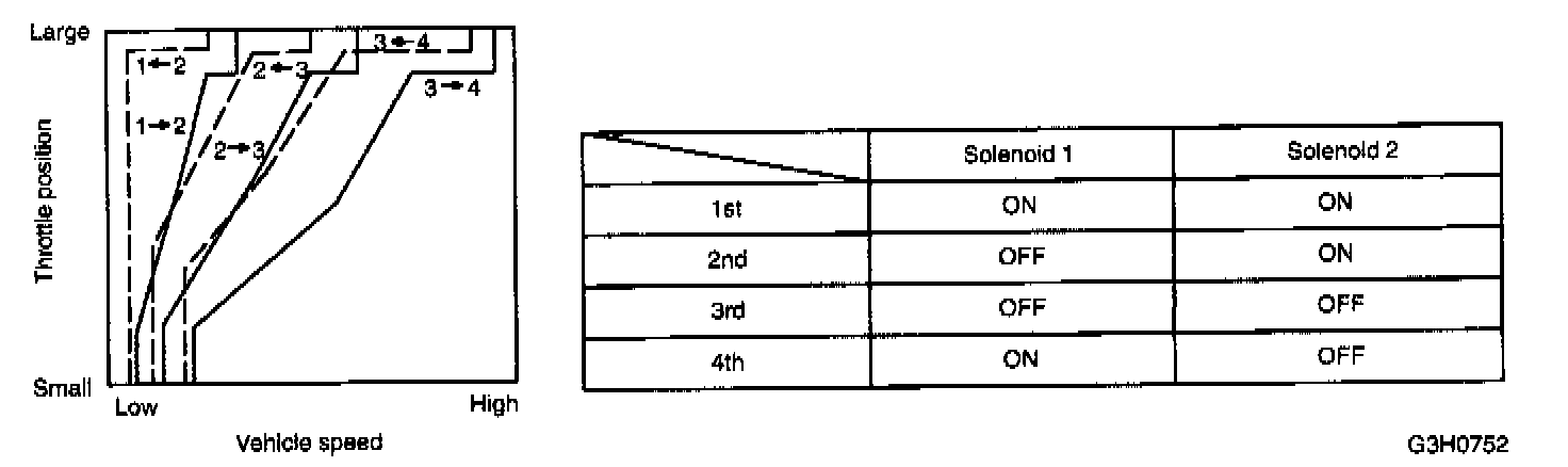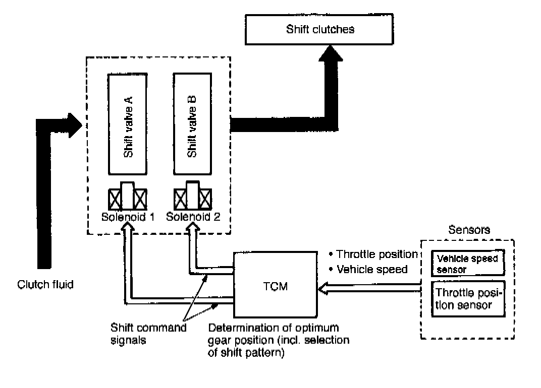 - Control module activates both solenoids 1 and 2 in response to throttle and vehicle speed signals.