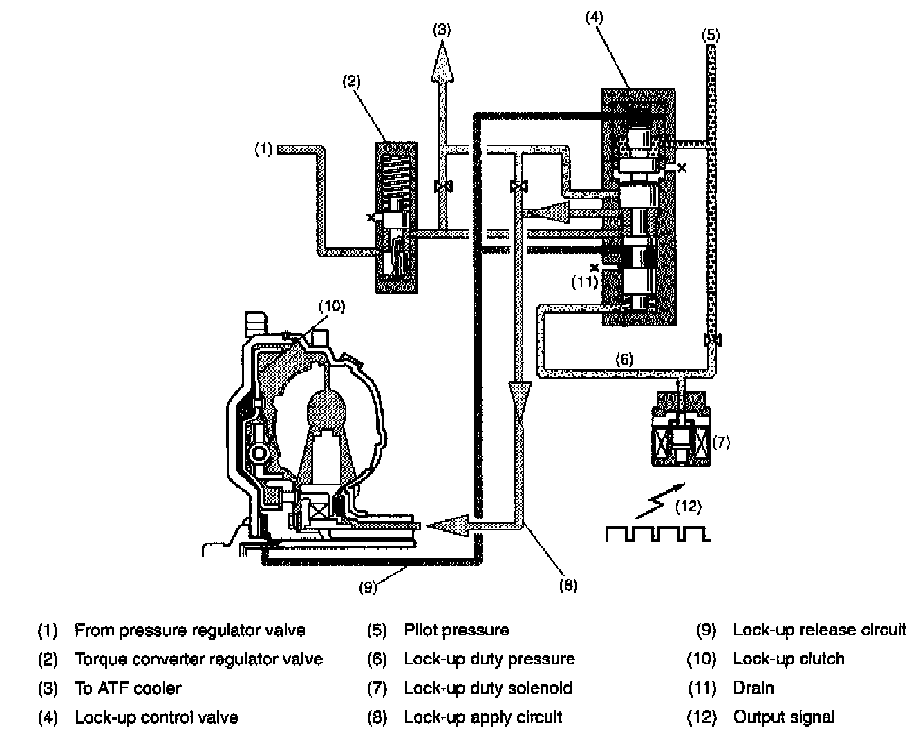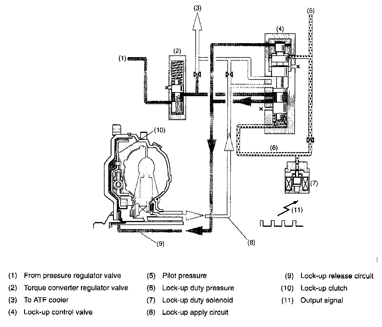 The Transmission Control Module (TCM) sends output signal to the lock-up duty solenoid. Since the lock-up duty solenoid operates in proportion to the duty ratio, the amount of ATF drained from there is increased, thus lock-up duty pressure being reduced.
