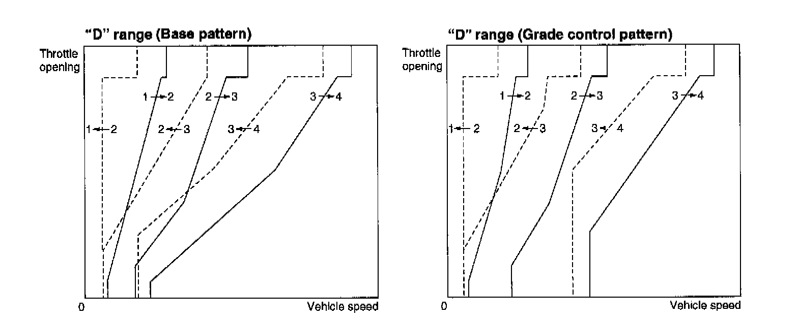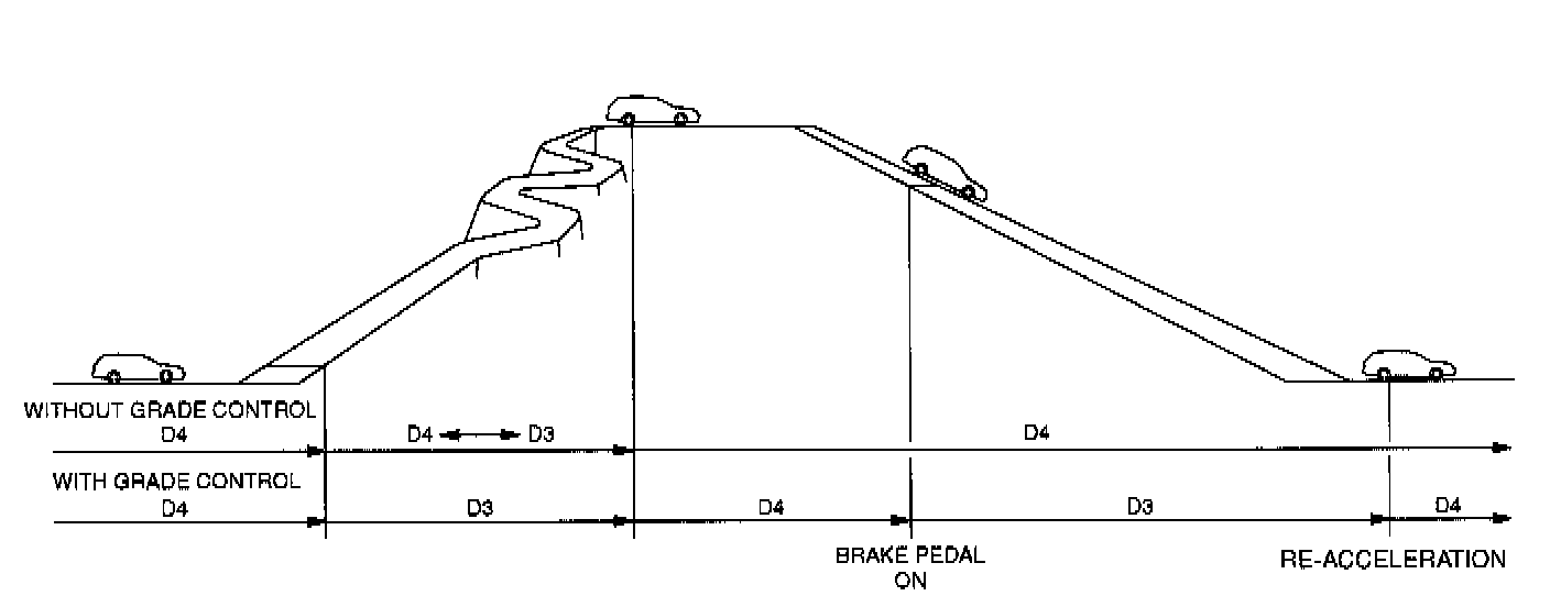 When a vehicle is descending a steep hill under the designated vehicle speed (approximately 50 miles/hour), 4th gear downshifts to 3rd gear automatically by depressing the brake pedal. This gearshift control is released by re-accelerating with depressing the accelerator pedal. These controls are doing this based on the combination of throttle opening angle, engine speed, vehicle speed and so on.
