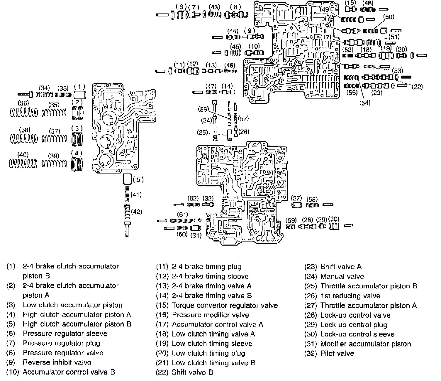 The control valve is composed of parts which are accurately machined to a high degree and should be handled carefully during disassembly and assembly. As these parts are similar in shape, they should be arranged in neat order on a table after disassembly so that they can be easily installed to their original positions. Spring loaded parts should be also handled carefully, as springs may jump out of place when the parts are disassembled or removed. Extreme care should be taken so as not to drop valves on the floor. Before assembling, the parts and valves should be dipped in a container filled with the ATF. Make sure that the valves are clean and free from any foreign material before assembly. Torque specifications should also be observed.