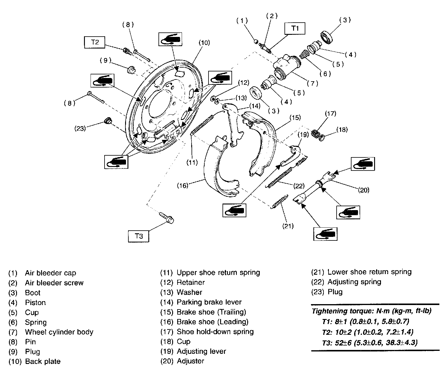Tightening torque: 14.7 +3/-2 Nm (1.5 +0.3/-0.2 kg-m 10.8 +2.2/-1.4 ft. lbs.)