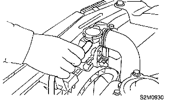 7) Disconnect radiator outlet hose (A) and water by-pass hose (B) (AT vehicles) from thermostat cover.