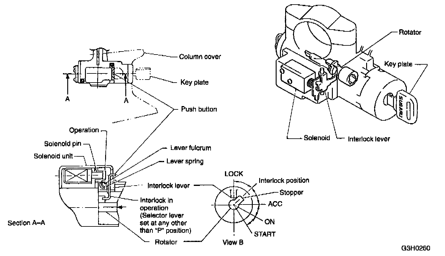 C: KEY INTERLOCK- When the selector lever is set at any position other than "P", the solenoid pin is ready for operation so that the interlock lever comes in contact with the rotator which turns together with the key plate. Thus, the ignition key is prevented from rotating up to the "LOCK" position.