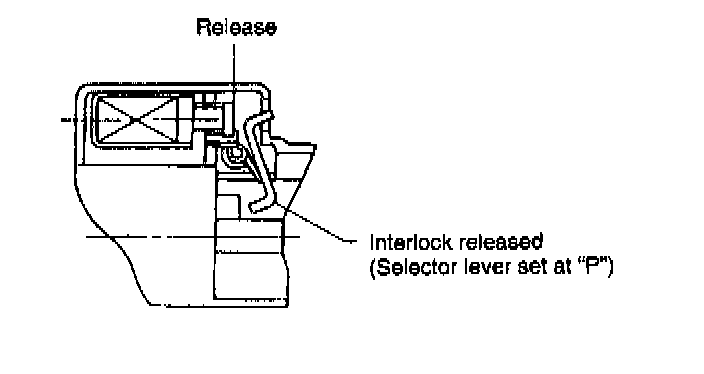 - When the selector lever is moved to "P", P position switch in the selector lever assembly turned ON, and the solenoid pin moves to the release position so that the lever spring disengages the interlock lever from the rotator's stopper. As a result, the key plate can be rotated to the "LOCK" position. The key orate can be inserted into or removed from the "LOCK" position only.