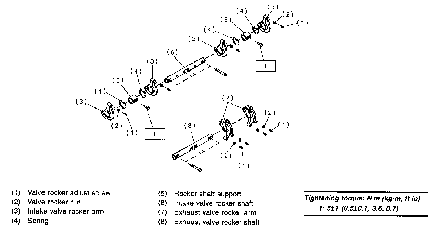 2) Arrange valve rocker arms, springs and shaft supports in assembly order and insert valve rocker shaft.