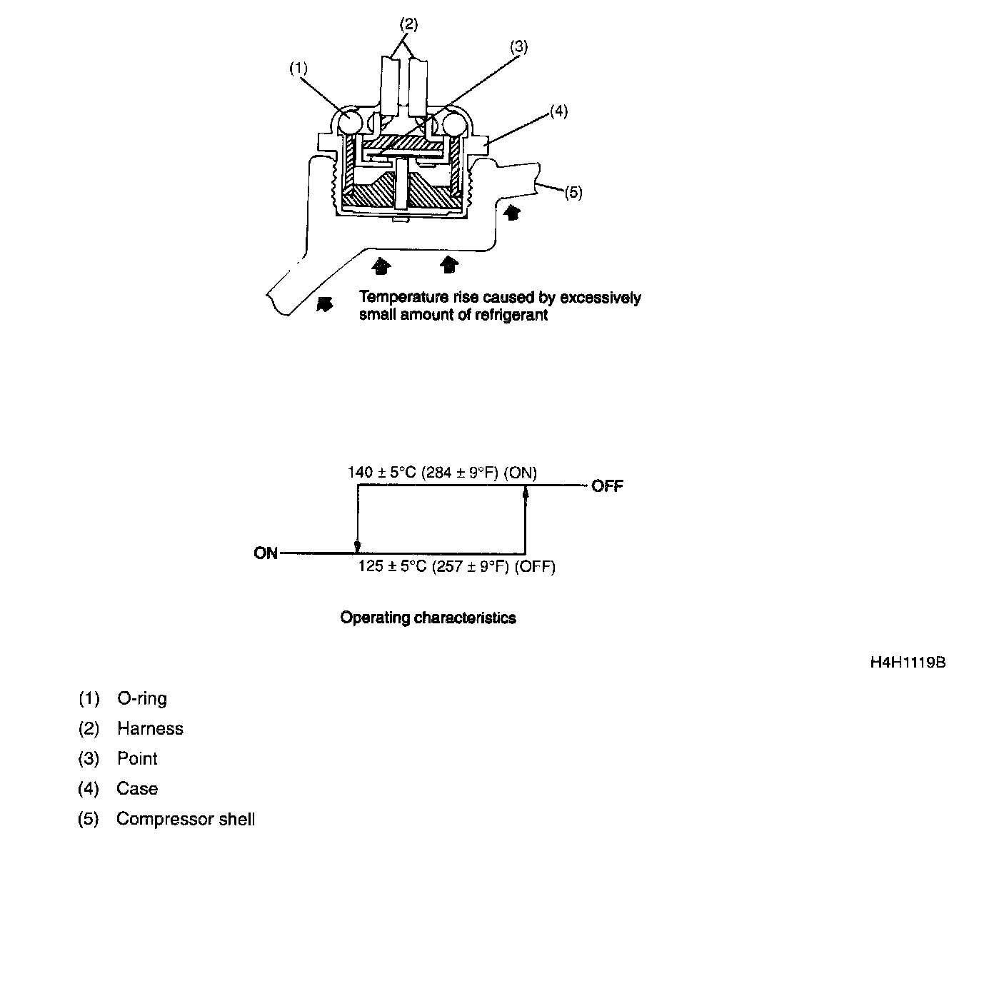 Compressor Saving SensorThe compressor saving sensor, mounted on the surface of the compressor case, forces the compressor to the OFF state when the gas temperature rises or the case surface temperature becomes abnormally high due to poor lubrication.